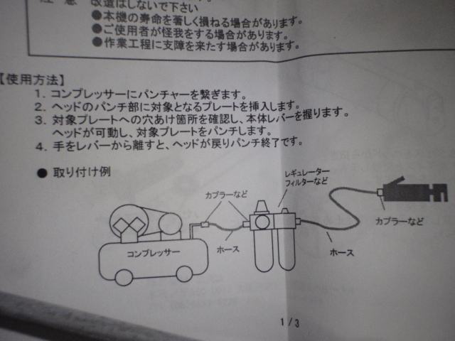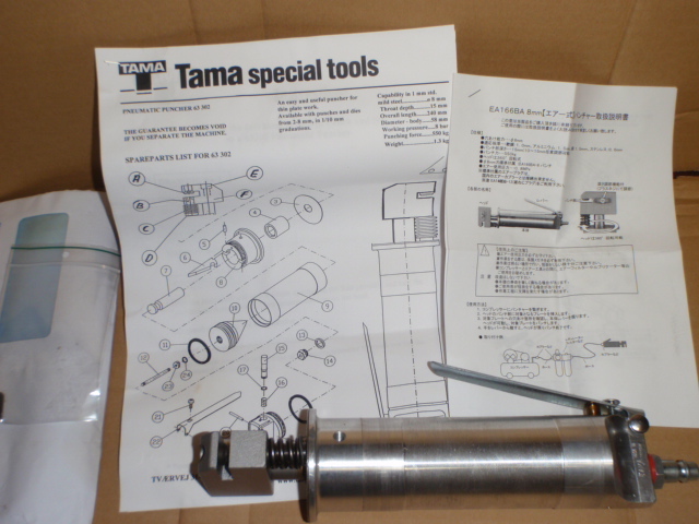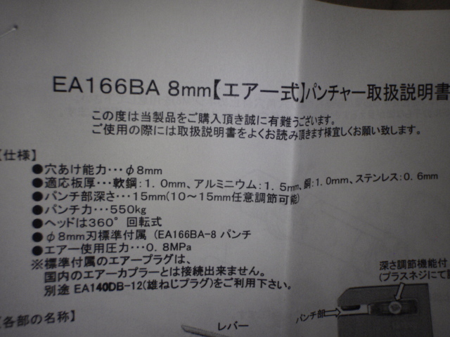 ◆エアーパンチ 8φ エスコ EA166BA 8㎜の穴あけ 軟鋼 1.0㎜ アルミ 1.5㎜ 銅 1.0㎜ ステンレス 0.6㎜ パンチ部深さ 10㎜~15㎜ 未使用品です。 |
