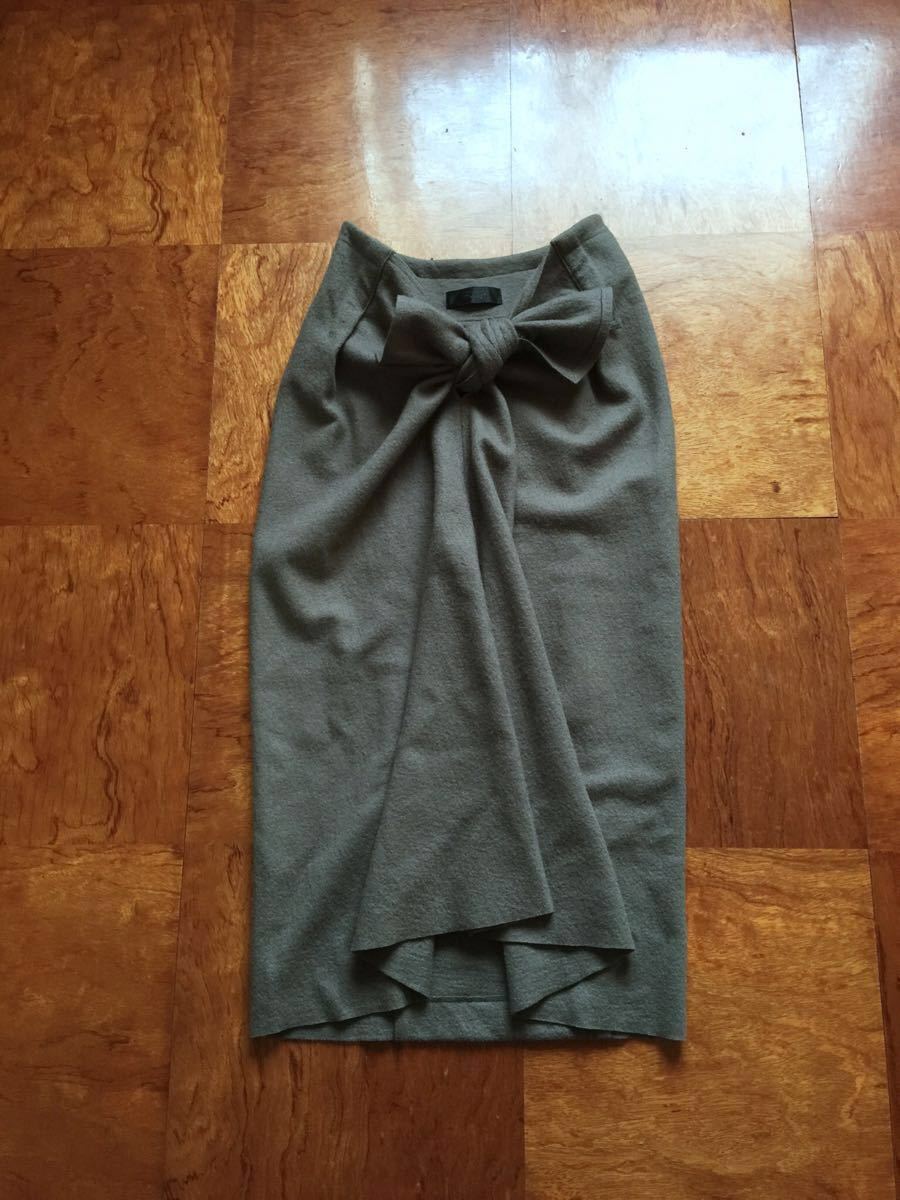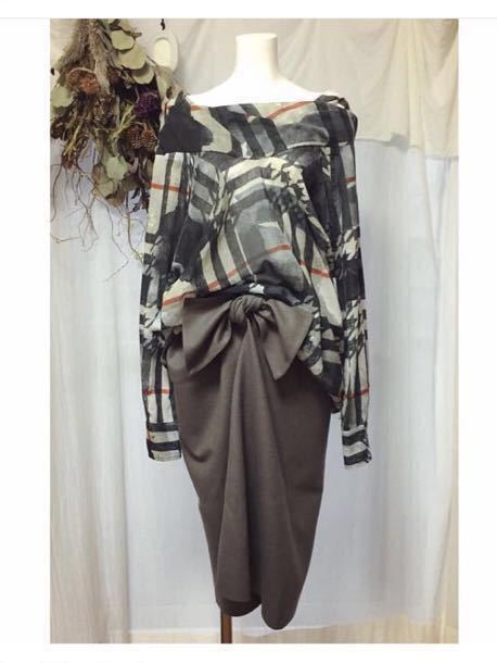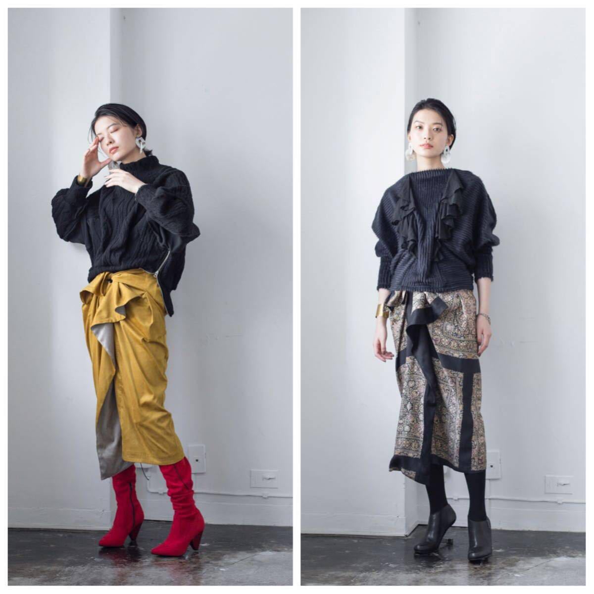 フロントにフレア分が入っていて、リボンのように結うことでタイトスカート型、前上がり、中心にドレープ生まれる独自のシルエットとなります。