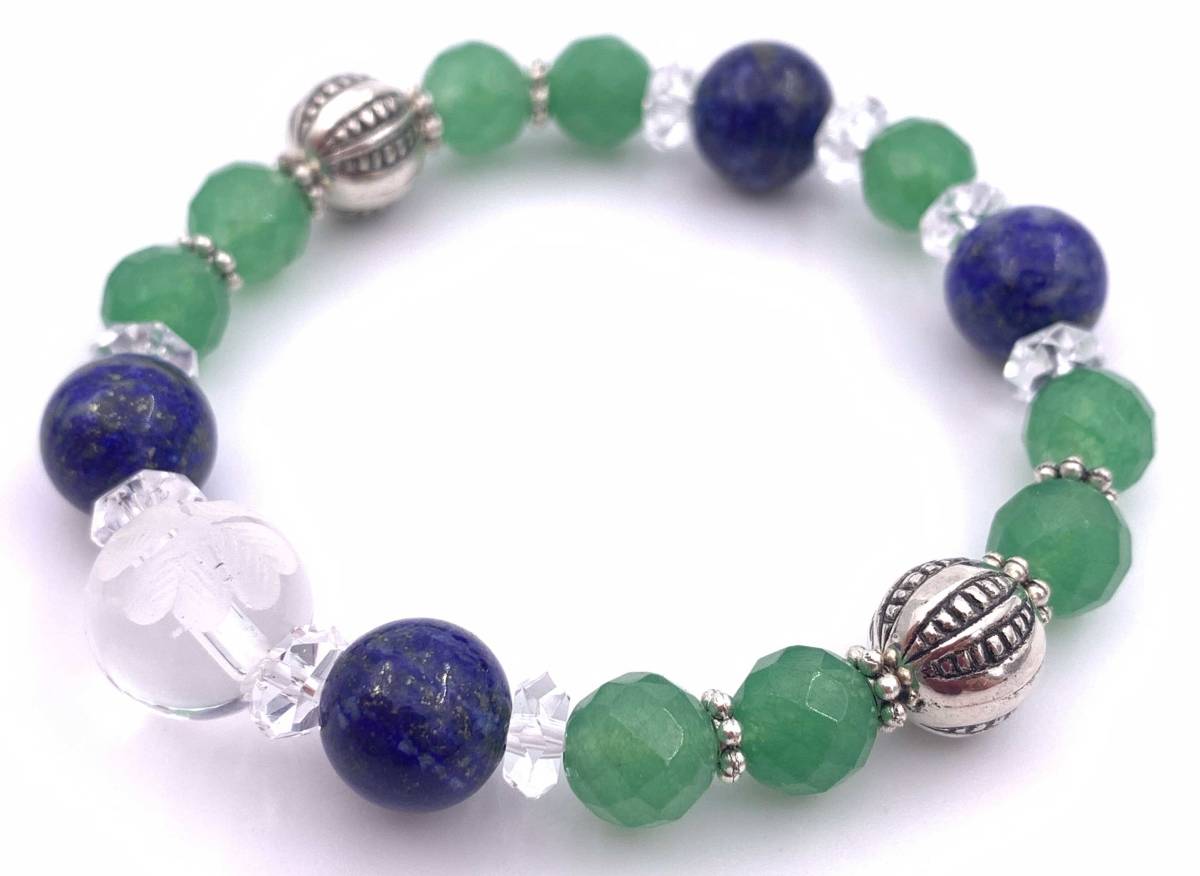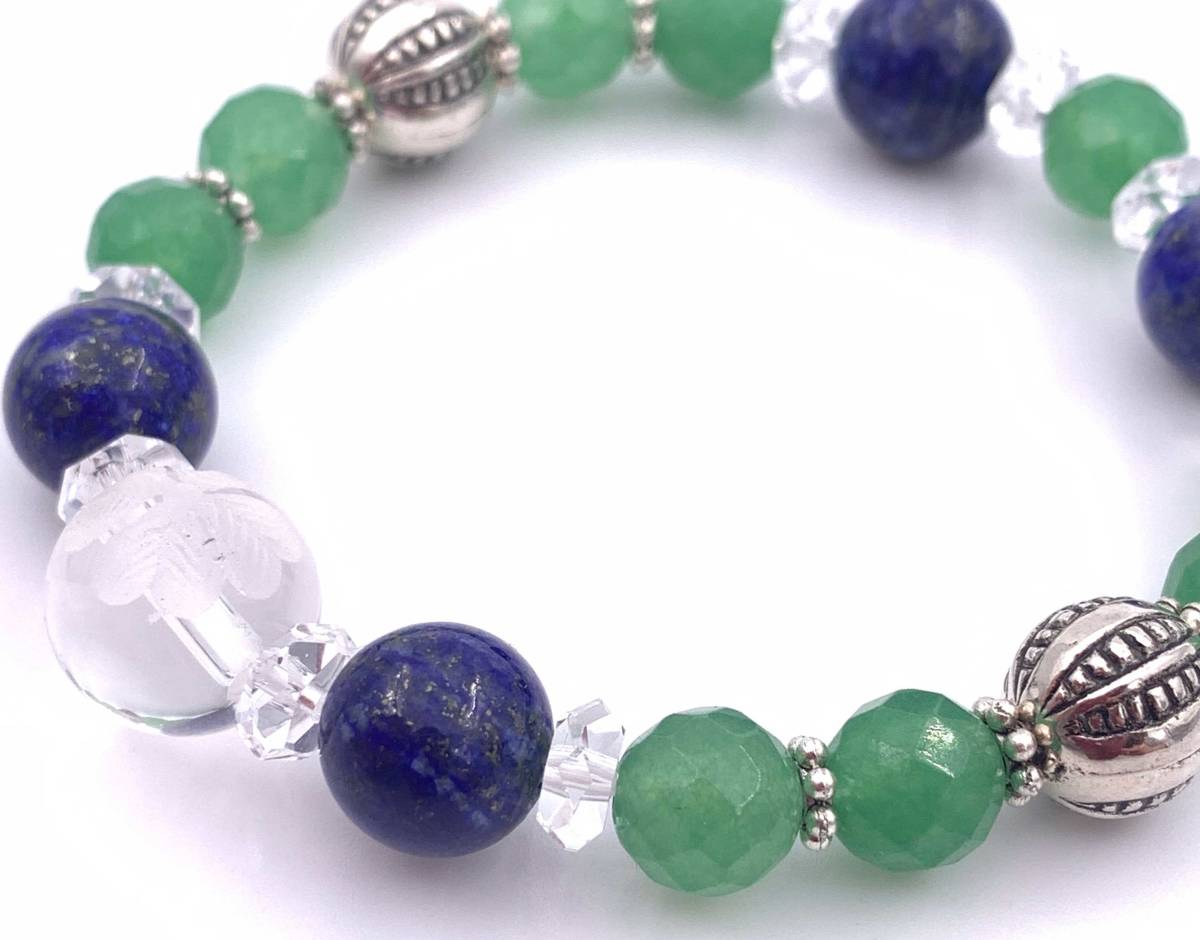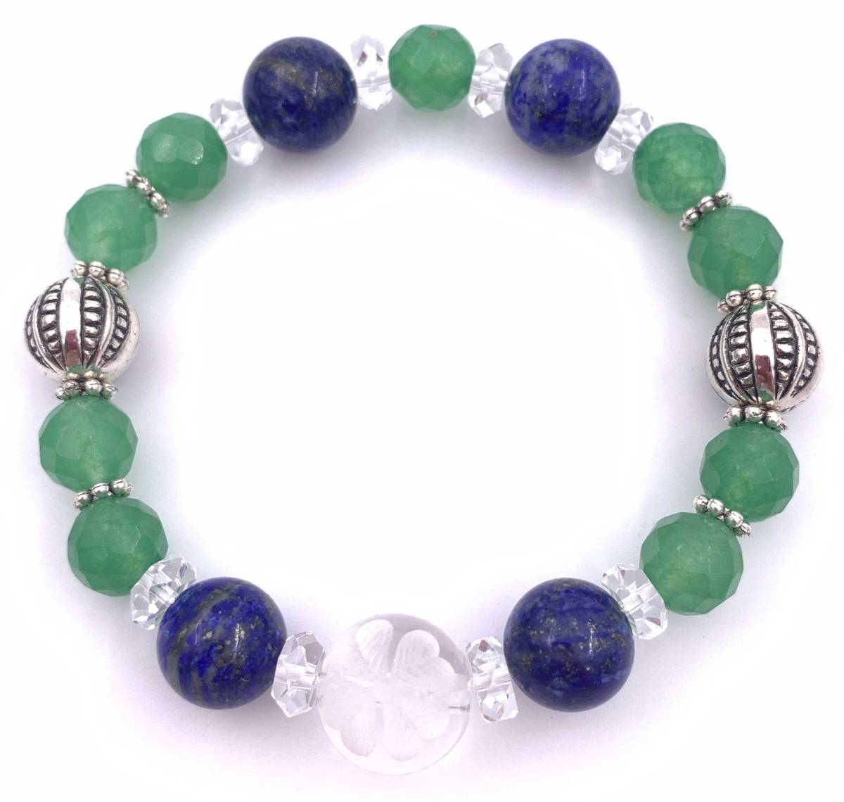 手作り!オリジナル!天然石彫り水晶四葉のクローバー&ラピスラズリ&アベンチュリンのブレスレット