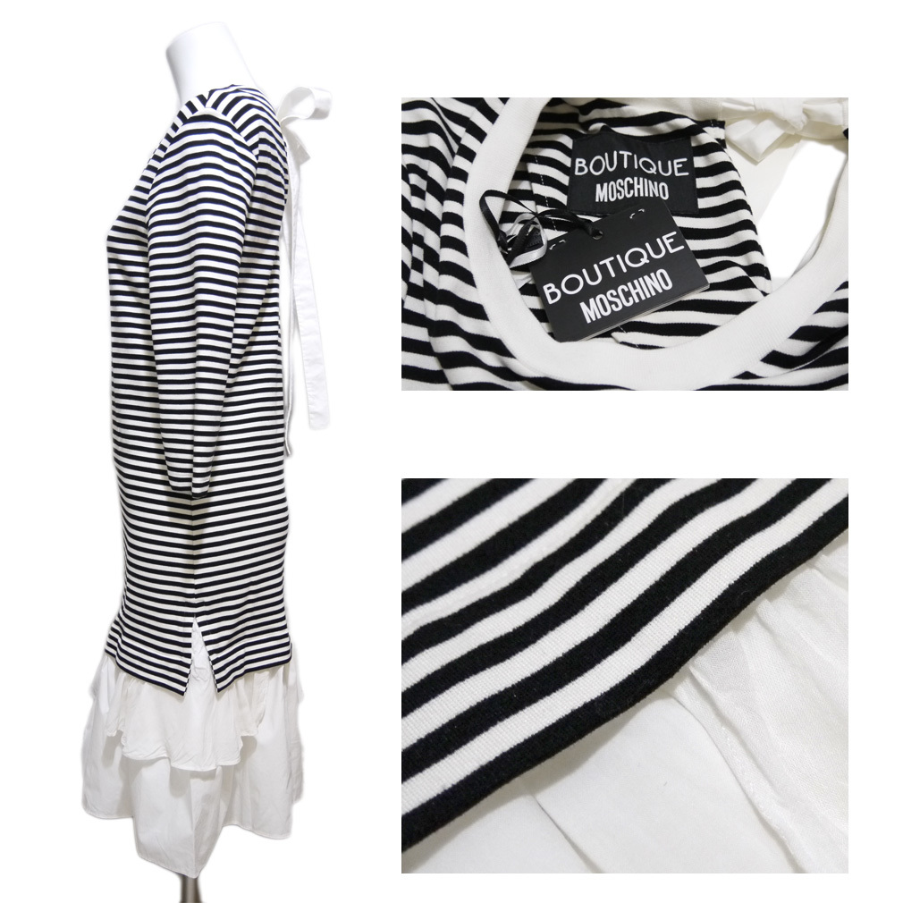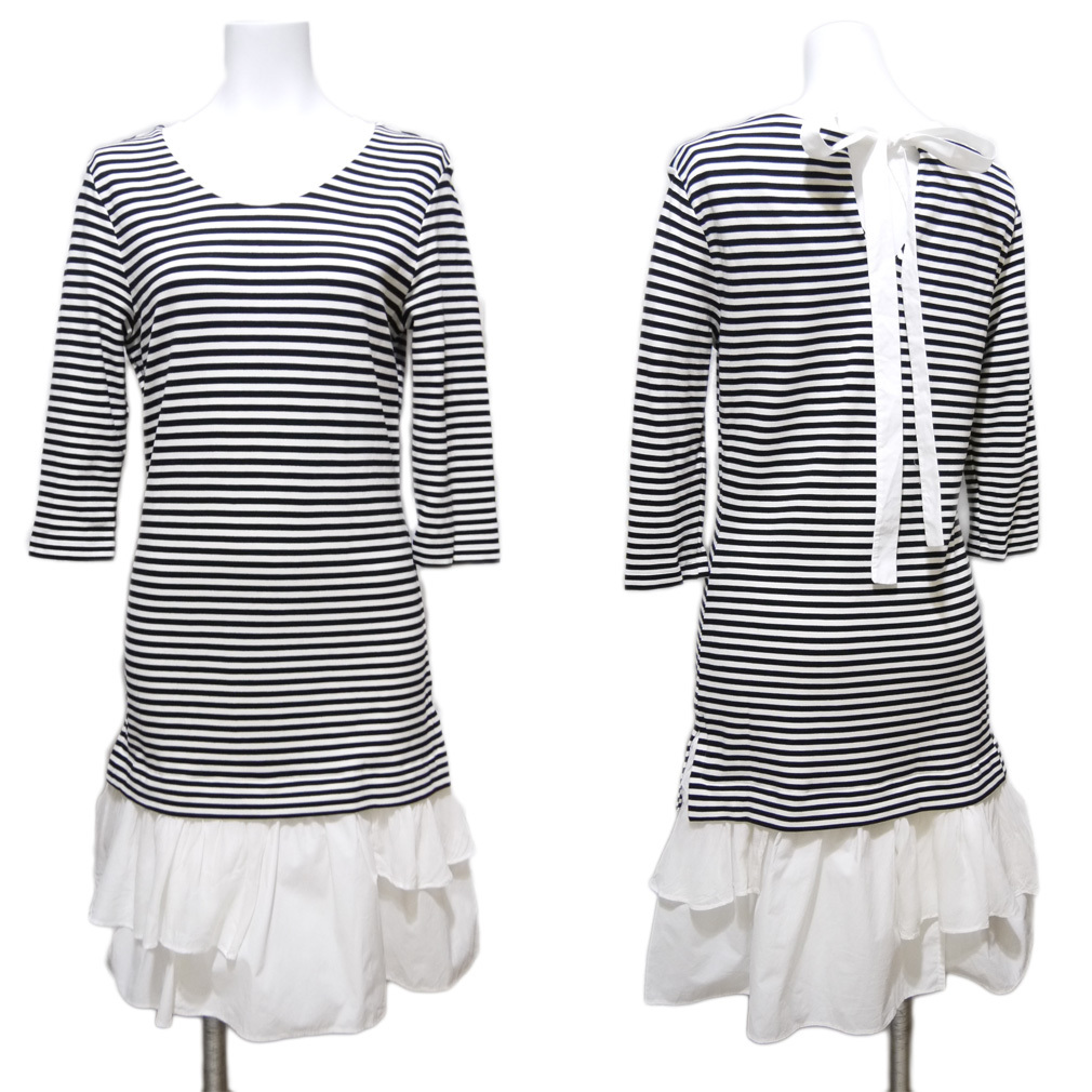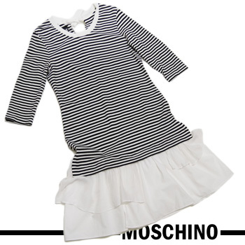 | 細ボーダーに白のフレアーが大人可愛いモスキーノのコットンワンピース。やや厚手のカットソー生地にスカート部分はガーゼのような薄手のコットンと布帛コットン生地のレイヤード。高身長の方におススメのバランスです。 |