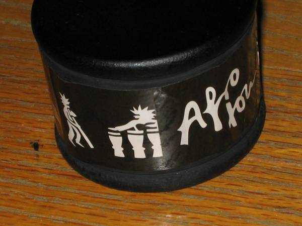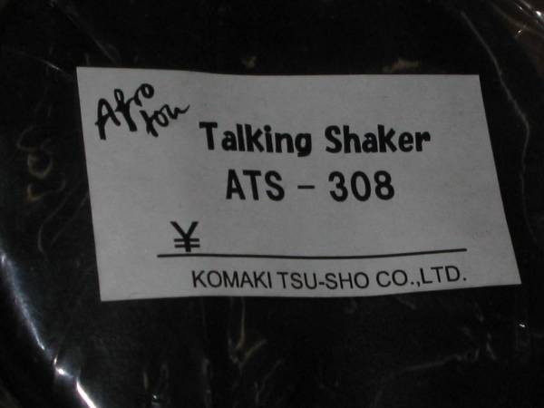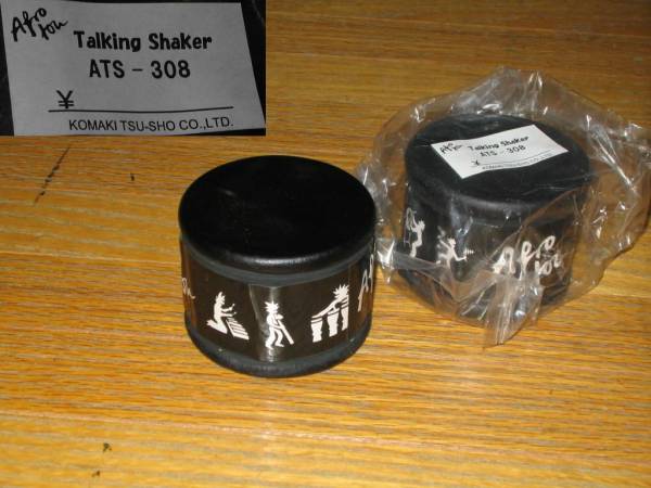 直径74mm高さ51mm位の小ぶりなシェイカーです。小さいですが表と裏に張ってある革のような感じのドラムシェイプになっており縦、横、回し等で軽快な音が出ます。シェル部分のシールが写真のように波打っていたりするB品扱いになりますので神経質お断り。オープンプライスですが¥3000円前後で売られていた商品になります。お送りするのは袋入り(1個)になります。