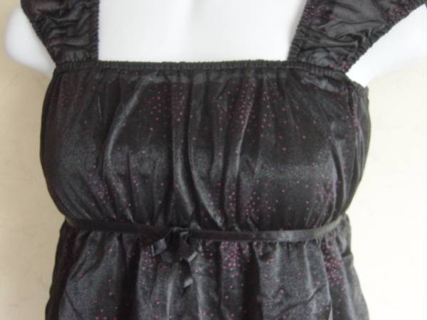 新品の、透け感がありてろっとした黒地に濃ピンクのラメドットをあしらったカットソー&黒のキャミソールアンサンブルです。