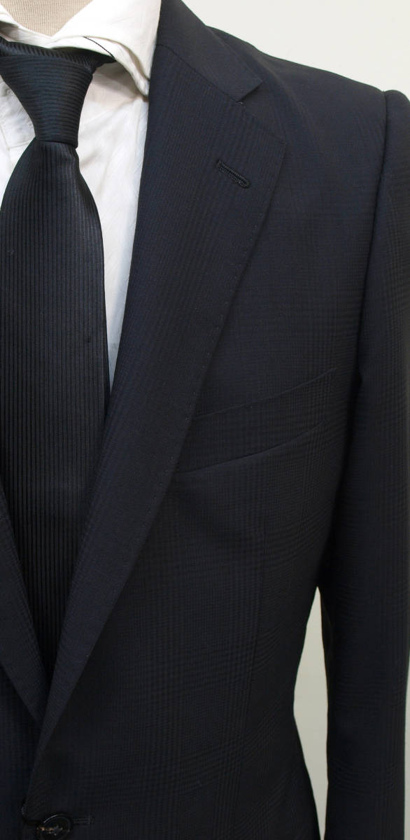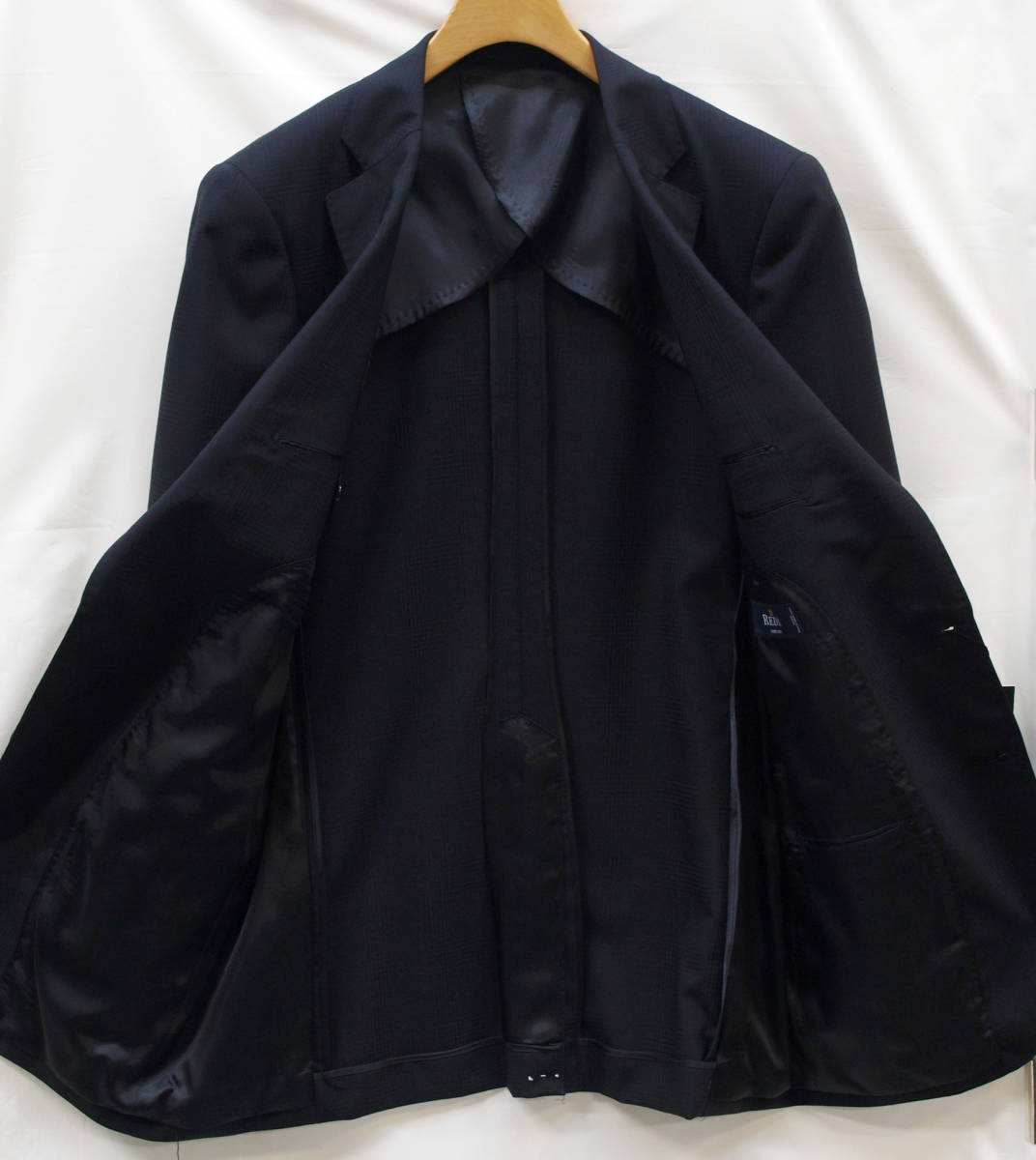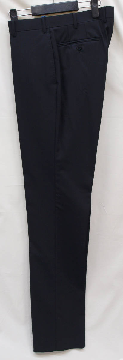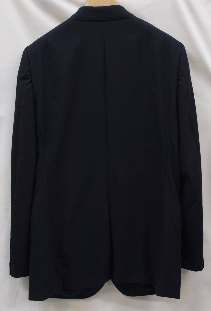 【サイズ】 A6(AL号サイズ相当) 目安の体型 身長170cm~180cm、ウエストサイズ82cm前後 【ジャケット実寸】 肩幅42.5cm 着丈71.5cm 袖丈62.5cm 脇下部分51cm 身幅46cm 【パンツ実寸】 ウエスト(胴回り実寸)82cm (平置きでかるくはかると82mでひっぱってはかると85cmです。股上が浅いため実寸が2cmほど大きめに作られております。) わたり幅32.5cm(股下10cmの部位で30cm) 裾幅20cm 脇股上22.5cm 前股上24.5cm 股下91cm(裾上げしていない状態/新品) 【素材】 表地:ウール100% 裏地:胴裏/ポリエステル100% 袖裏/キュプラ100% ・イタリア、REDA/レダ社のSUPER 110'S ウール生地を使用 【色】 黒色 【柄】 シャドウグレンチェック織柄 ・しなやかでほどよいハリがある春夏向けの上質な紳士スーツ向けウール素材です。 ・メーカー希望小売価格 税込み62640円 春先~夏~秋口にかけて春夏メインのシーズン対応商品 【デザイン】 コンパクトな印象の細身ですっきりとしたシルエット、タイトフィットスリム、ビジネススーツ新品、裾上げしていない状態です。 ・ジャケットはシングル2つボタンのスリムモデル ・パンツは股上が浅めで細いシルエットのノータックスリムパンツ 【縫製仕様】 ・ジャケットはシングル2つボタン、ノッチドラペル、襟縁等AMFステッチ入り、袖口ボタン4つ、センターベント、内ポケット4つ(小ポケット2つ含む)、背抜き(春夏物) ・パンツはノータック、ウォッチポケット付き、膝裏当て付き、脇ポケット縦付け、後ろポケット両玉縁で左のみボタン付き、フロントはファスナーでボタン&ホック仕様/うちかけボタンあり 使用付属(毛芯、裏地、ボタン等々)もワンランク上のを使い、細部まできれいな縫製仕立てで仕上がっております。