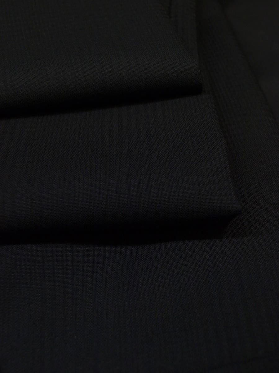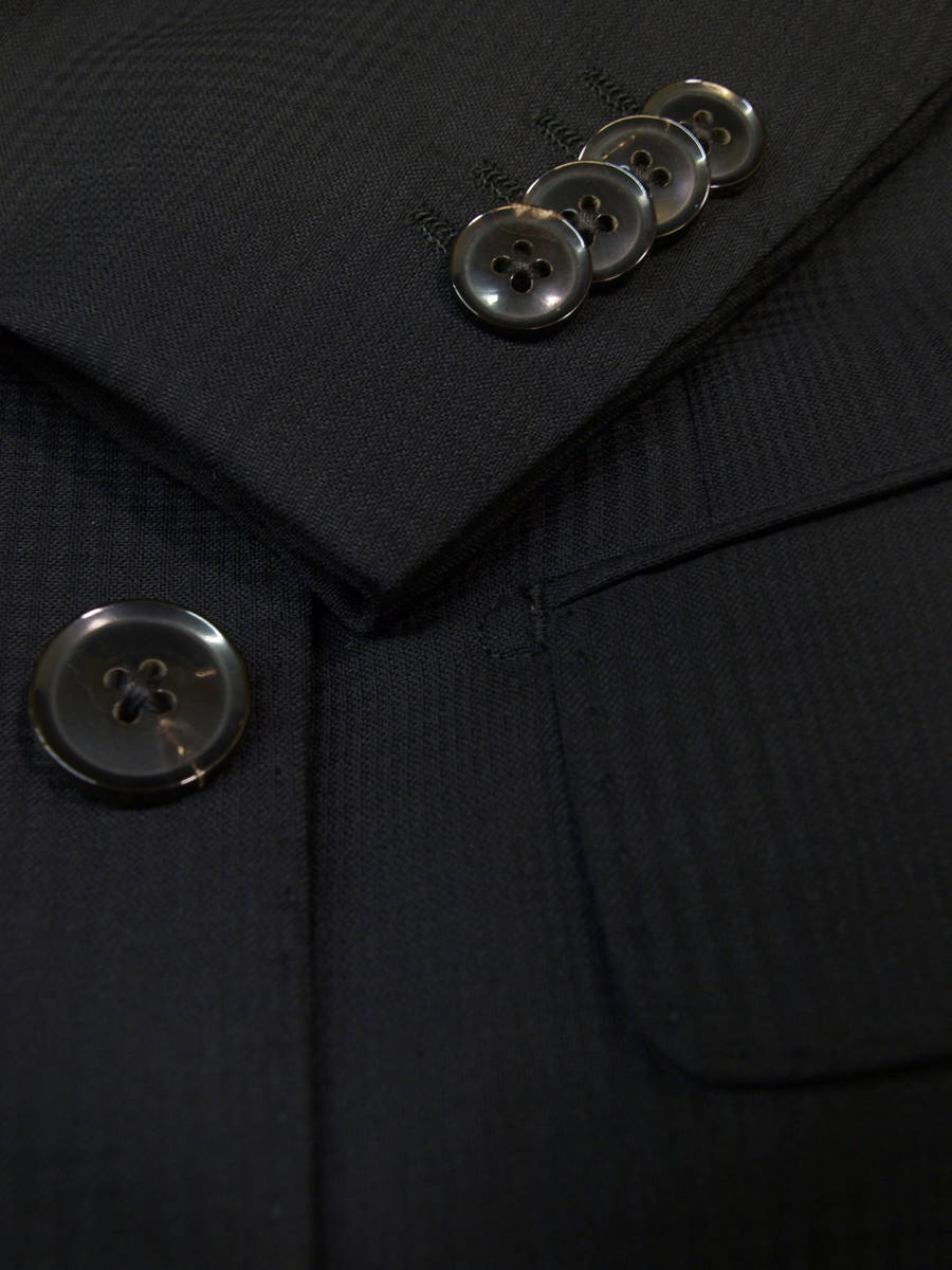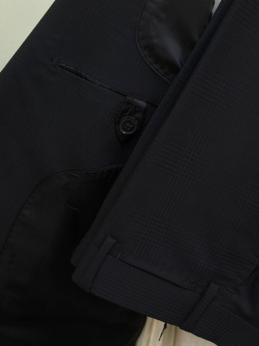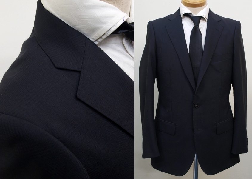 【サイズ】 A6(AL号サイズ相当) 目安の体型 身長170cm~180cm、ウエストサイズ82cm前後 【ジャケット実寸】 肩幅42.5cm 着丈71.5cm 袖丈62.5cm 脇下部分51cm 身幅46cm 【パンツ実寸】 ウエスト(胴回り実寸)82cm (平置きでかるくはかると82mでひっぱってはかると85cmです。股上が浅いため実寸が2cmほど大きめに作られております。) わたり幅32.5cm(股下10cmの部位で30cm) 裾幅20cm 脇股上22.5cm 前股上24.5cm 股下91cm(裾上げしていない状態/新品) 【素材】 表地:ウール100% 裏地:胴裏/ポリエステル100% 袖裏/キュプラ100% ・イタリア、REDA/レダ社のSUPER 110'S ウール生地を使用 【色】 黒色 【柄】 シャドウグレンチェック織柄 ・しなやかでほどよいハリがある春夏向けの上質な紳士スーツ向けウール素材です。 ・メーカー希望小売価格 税込み62640円 春先~夏~秋口にかけて春夏メインのシーズン対応商品 【デザイン】 コンパクトな印象の細身ですっきりとしたシルエット、タイトフィットスリム、ビジネススーツ新品、裾上げしていない状態です。 ・ジャケットはシングル2つボタンのスリムモデル ・パンツは股上が浅めで細いシルエットのノータックスリムパンツ 【縫製仕様】 ・ジャケットはシングル2つボタン、ノッチドラペル、襟縁等AMFステッチ入り、袖口ボタン4つ、センターベント、内ポケット4つ(小ポケット2つ含む)、背抜き(春夏物) ・パンツはノータック、ウォッチポケット付き、膝裏当て付き、脇ポケット縦付け、後ろポケット両玉縁で左のみボタン付き、フロントはファスナーでボタン&ホック仕様/うちかけボタンあり 使用付属(毛芯、裏地、ボタン等々)もワンランク上のを使い、細部まできれいな縫製仕立てで仕上がっております。