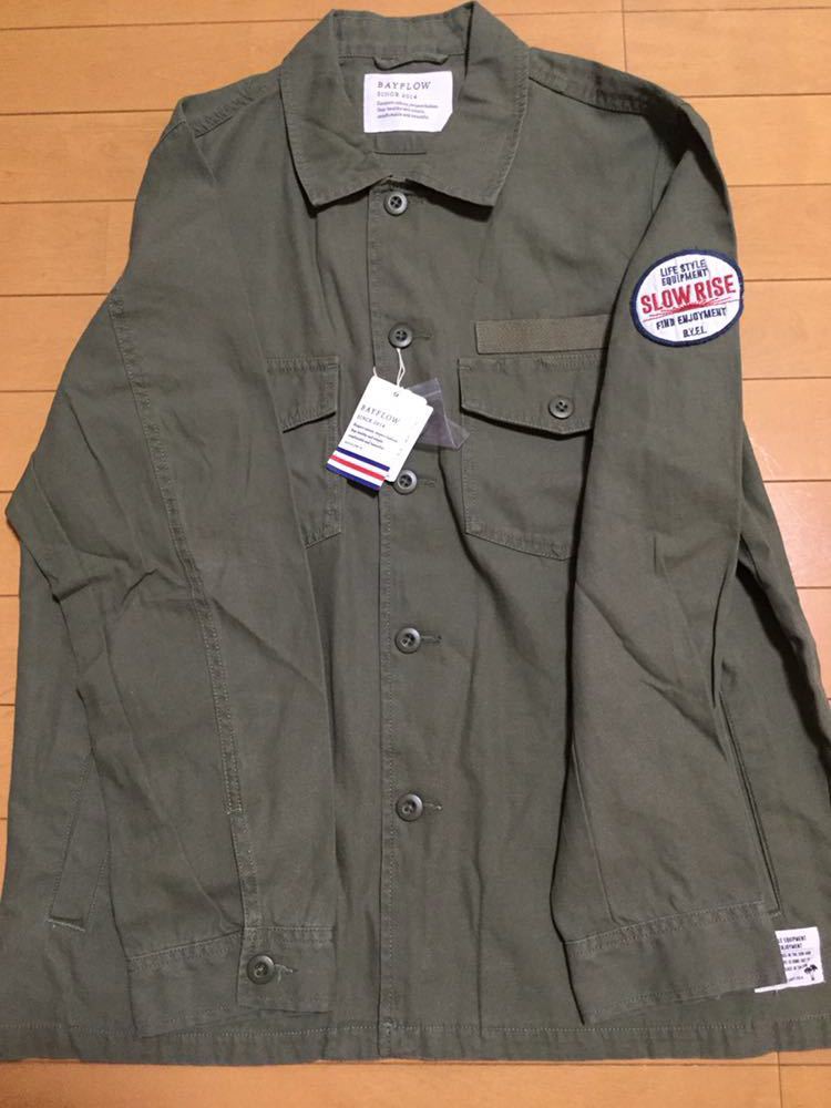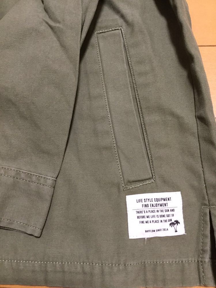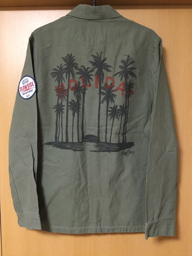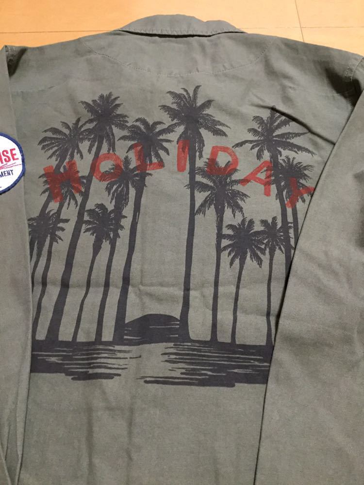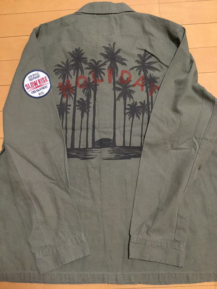 カーキ(バックプリント): 背面のヤシの木プリントと左袖にあしらったワッペンでショアムード満点に