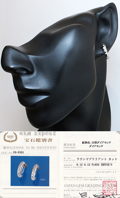 ●左右合計で10石・0.24カラットのダイヤをセットしたイヤリングです♪ ●ダイヤは無色系の美しいカラーとなり、キラキラとした輝きが綺麗♪ ●定番・人気のフープのデザインで、耳元に洗練されたファッション・ポイントを演出します♪ ●高級素材のPt850(プラチナ)製となり、末永くご使用頂ける確かな品質でございます♪ ●左右とも、片側ずつのカラットと素材を示す「Pt850 0.12」の刻印がございます♪ ●「鑑別書・ケース・送料」込みのお値段となります♪ 消費税は発生いたしません♪ ●写真でジュエリーが黒く写っている部分は、カメラの写り込みです♪ 実物に汚れ・キズ等があるわけではございませんのでご安心ください♪ ●3枚目の写真のマネキンは等身大より一回り小さめになり、あくまでイメージ画像となります。商品のサイズにつきましては、別途、縦横のサイズ表記がございますので、そちらをご覧ください♪ | |