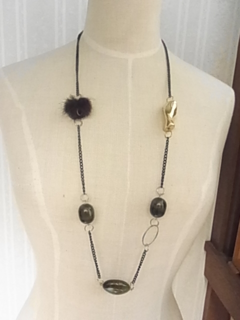 やや訳あり安価 品質不明 マーブル模様のストーン調と金色の装飾とファー付き ロングネックレス◆◆