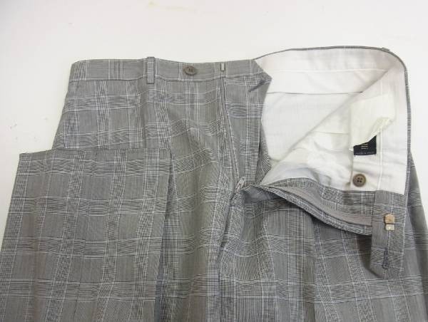 サイズは48、襟下からの着丈77cm(サイドベンツの総裏)・肩幅46cm・袖丈64cm・身幅52cm・ウェスト82cm(+4cm出し可能)・股上27cm・股下92cm(裾上げ未了)、裾幅21cmになります。