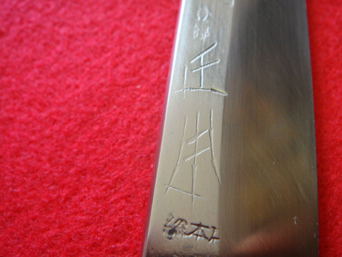 ※刃先は緩やかに跳ね上げて研がれています。柄は水に強い焼き栗柄に交換されています。
