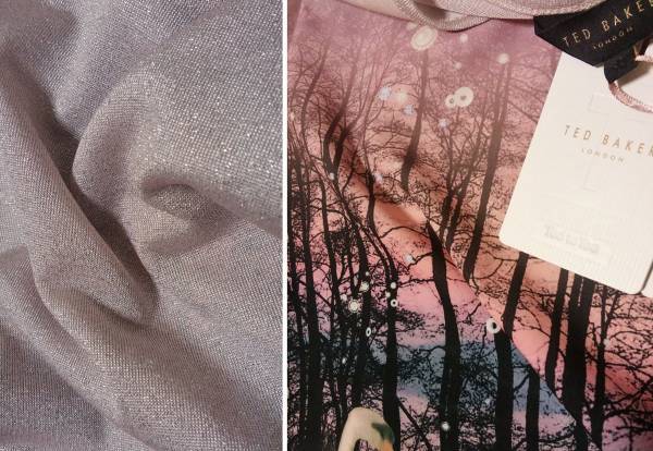 全体に薄いピンクで後ろ側はシルバーラメが織り込まれたさらっとした素材です。オールシーズン対応可。