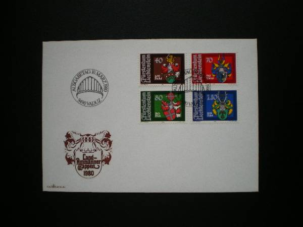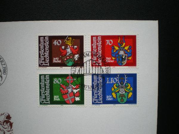 リヒテンシュタイン公国1980年発行 剣を持つライオンなど紋章切手 4種完貼り NH グラビア印刷 初日カバー美品です。