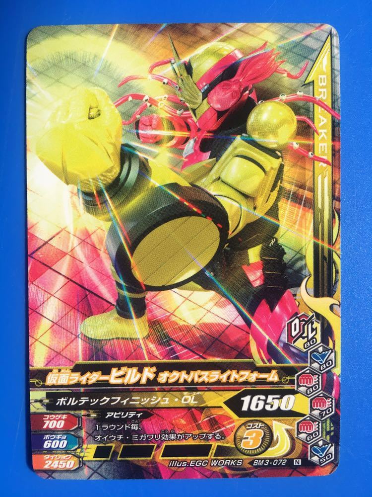 仮面ライダー、ガンバライジング・第BM3弾からNo.072《仮面ライダービルド・オクトパスライトフォーム》の登場です。発送は、普通郵便を利用します。(特にご希望のない場合)おとりまとめも可能ですが、送料に変動する場合がございます。また、送料のご請求は、自宅での計量を基準にご請求させていただいておりますので、実際の金額と差異が出る場合もございます。予めご了承ください。他にも多数出品中です。まとめてこの機会にいかがでしょうか?ご質問お待ちしております。