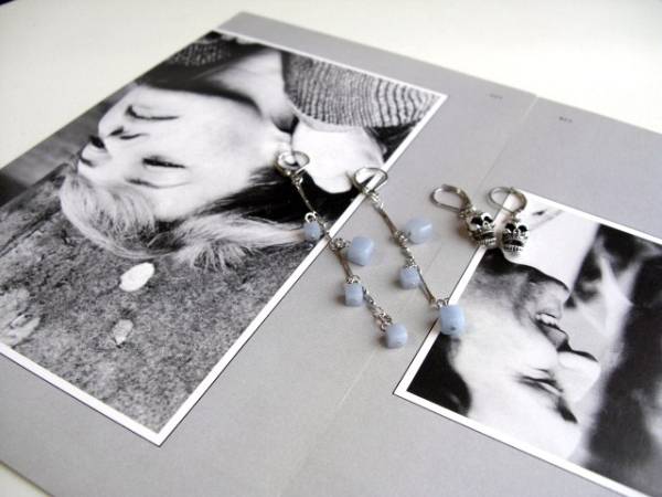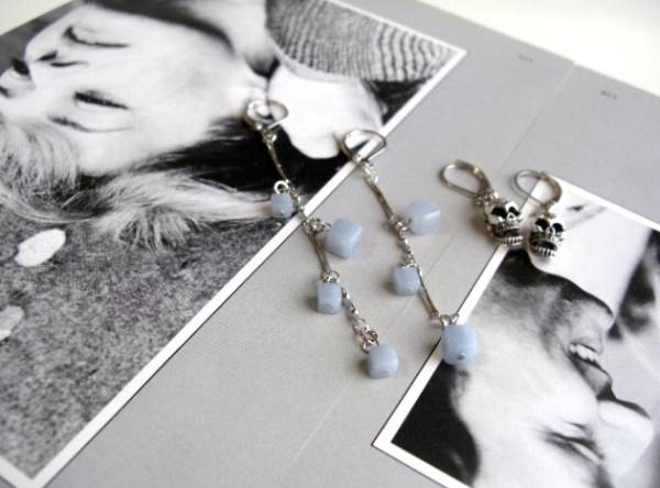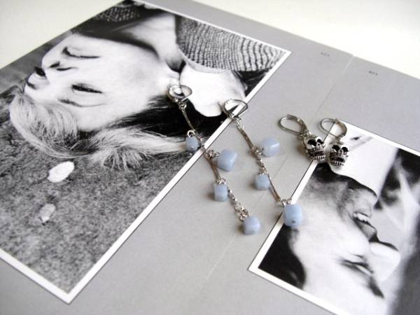 アンティーク仕様・・シリーズです♪アリスの水色・・繊細な水色のエンジェライトのピアスと髑髏さんのピアスです♪ペア2組です♪♪エンジェライトのピアスは長さ違いです♪色々な組み合わせで楽しんでいただけます♪シックなブルーグレーのエンジェライトは4ミリ、6ミリの大きさ違いのキューブです♪デザインチェーンに紡ぎました♪長い方は9センチ、短い方は7センチ位です♪髑髏さんは15ミリ位です♪ピアスの長さは3センチ位です♪それぞれイヤリングにも変更出来ます♪お揃いのネックレスやブレスレットも出品しています♪シンプルで長く着けていただけるデザインを考えて作りました!ハンドメイドをご理解頂いてノークレーム、ノーリターンでお願いします