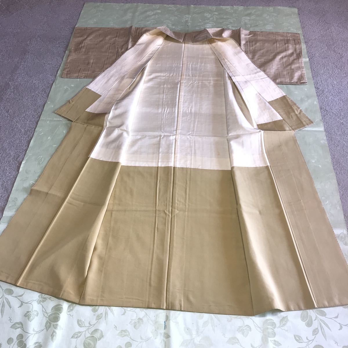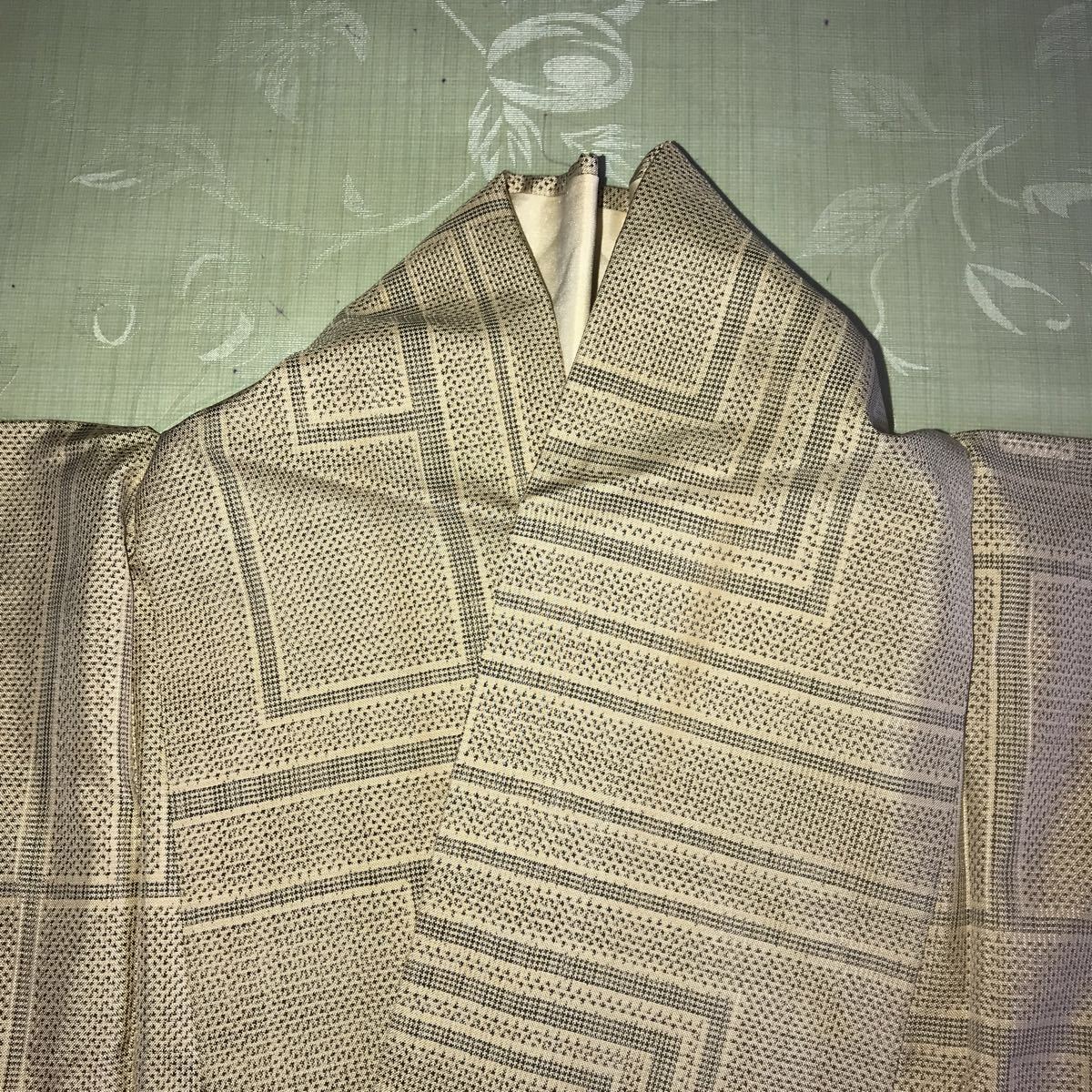 ・女性用 着物 絹 大島紬 広衿 白黄土色地 グレイの線柄