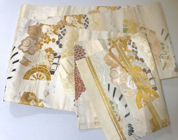 中古美品。絹。オフホワイト生成りベージュの丸帯。白っぽい