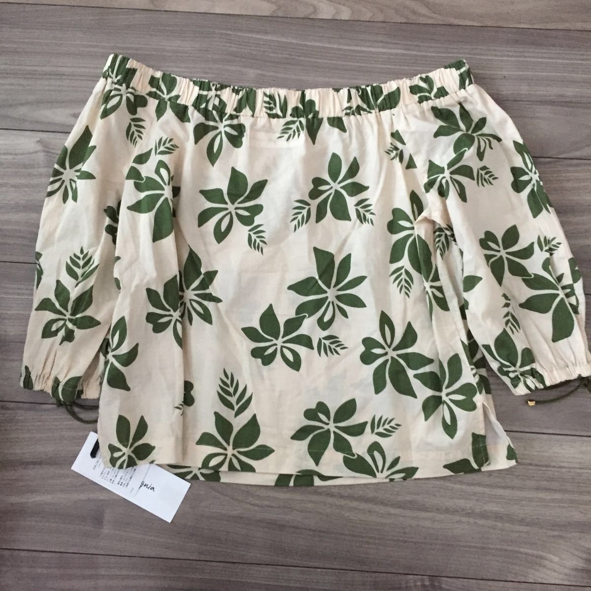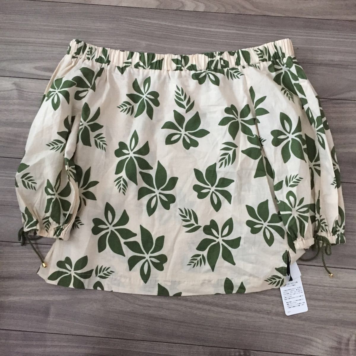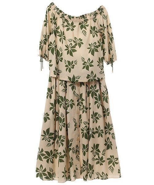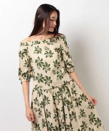 どこかトロピカルな雰囲気香るフラワー&リーフプリントを、大人っぽい単色使いでシックにまとめたオフショルダーブラウス。