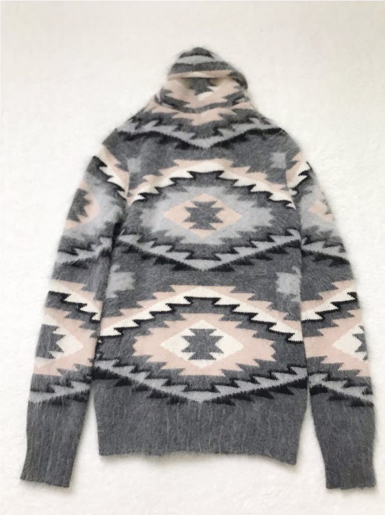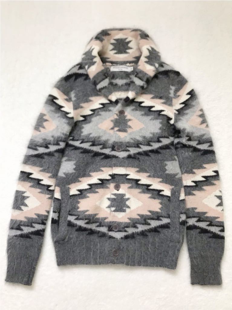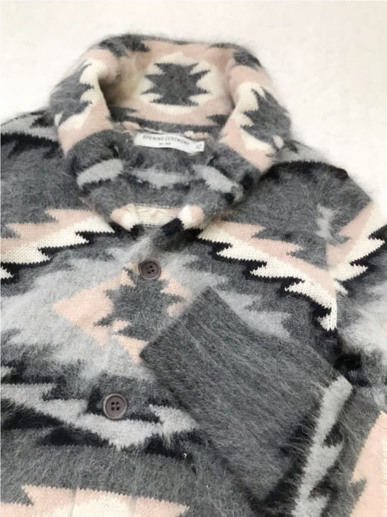 ・アンゴラの起毛感ある柔らかでとても上質なニットを使用し計算されたモダンで美しいシルエット、バランスの良さに個性的な柄デザインが雰囲気抜群でとてもお洒落なカーディガンになります。