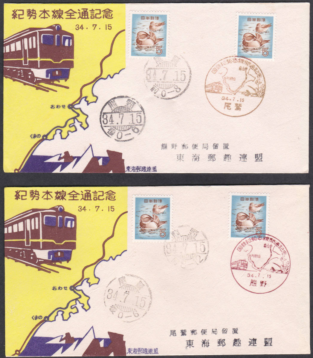 鉄道記念カバー 1959年 紀勢本線全通記念 熊野ー尾鷲  2通  東海郵趣連盟