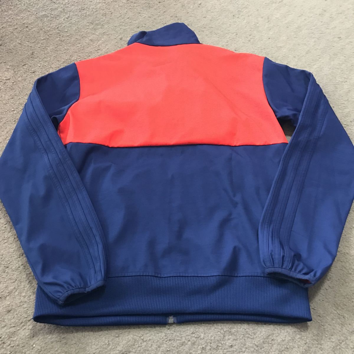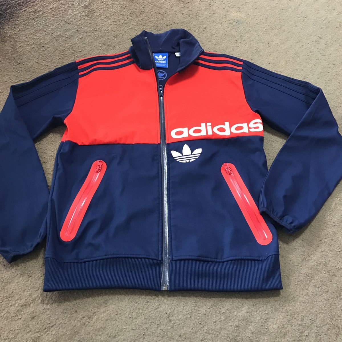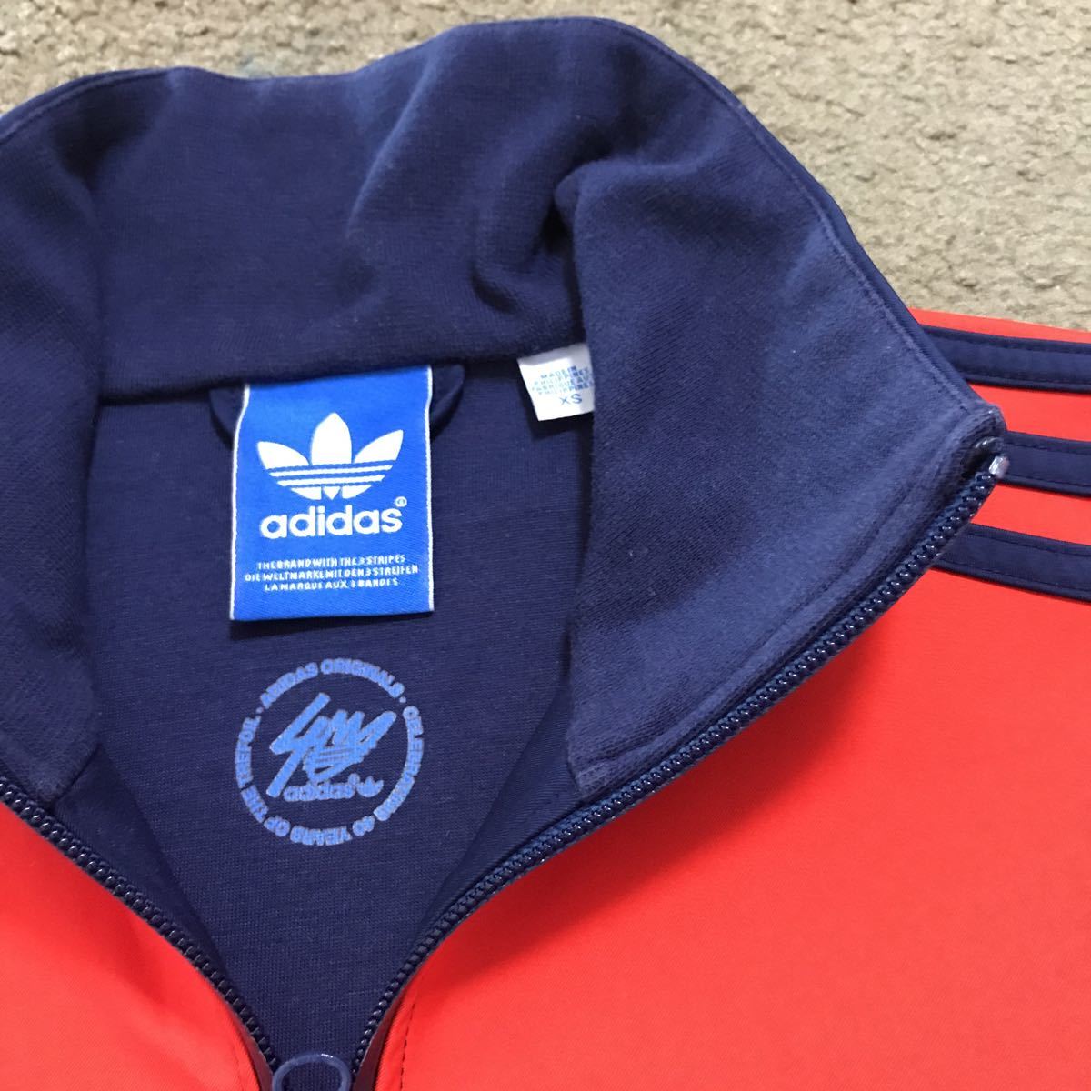 40周年記念モデル アディダスオリジナルトレフォイルジャケットです。XSサイズ、ポリエステル100%、ネイビー×レッドです。実寸は肩幅45、身幅50、着丈64、脇下袖丈51.5cmです。ネットでも見かけないレアモデルです。探していた方、この機会に如何ですか。