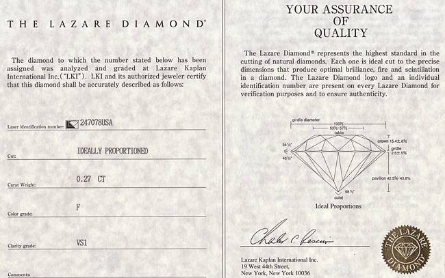 カット | IDEALLY PROPORTIONED(理想的なプロポーションの意味) ※ラザールダイヤモンドは、ダイヤモンドの「世界三大カッティング・ブランド」として、ダイヤのカットに絶対的な自信を持っているため、エクセレントやベリー・グッド等の一般的なカット・グレードを表記しておりませんが、一般的に言う「EX(エクセレント)」クラスの上質なカットとなっております。 | |