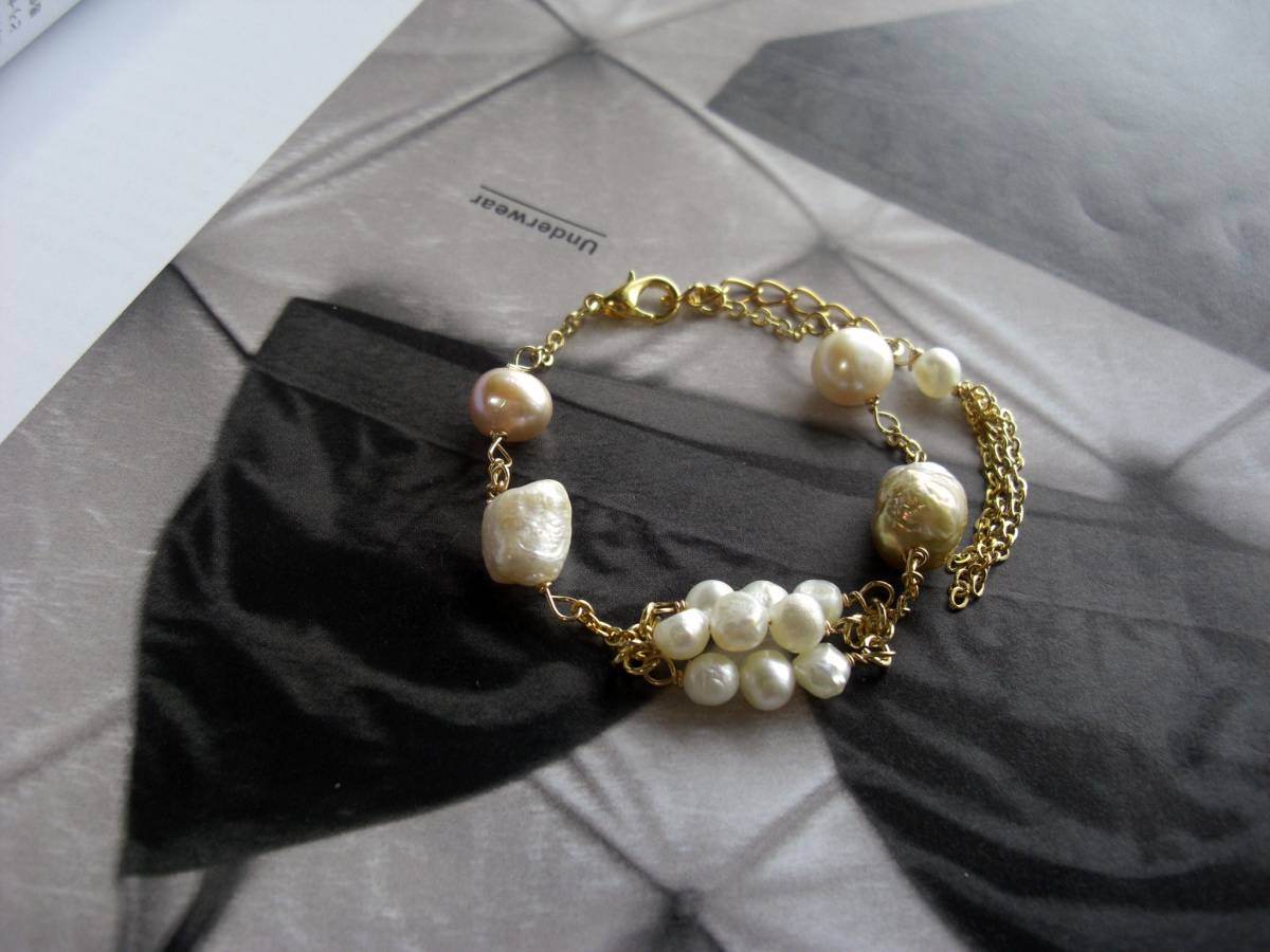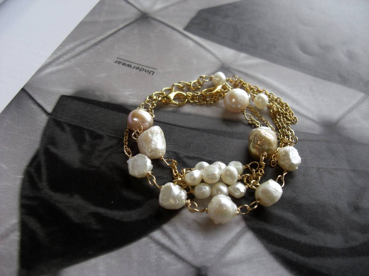 私的スタイル・・シリーズです♪パールをアートして・・個性的なバロックパールのブレスレットです♪8ミリから14ミリ位までのバロックパールのデザイン違 いの2点セットです♪左側の画像のブレスレットはオフホワイトやパープルピンクの母貝つきのバロックパールに小 粒のパールを合わせました♪さりげなくアンティークな表情です♪♪長さは17センチ+アジャスター5センチで最長22センチ位です♪右側のブレスレットは8ミリ位のオフホワイトのバロックパールです♪長さは17センチ+アジャスター5センチで最長22センチ位です♪それぞれ単品や お揃いのネックレスやピアスも出品しています♪ハンドメイドを ご理解頂いてノークレーム、ノーリターンでお願いします