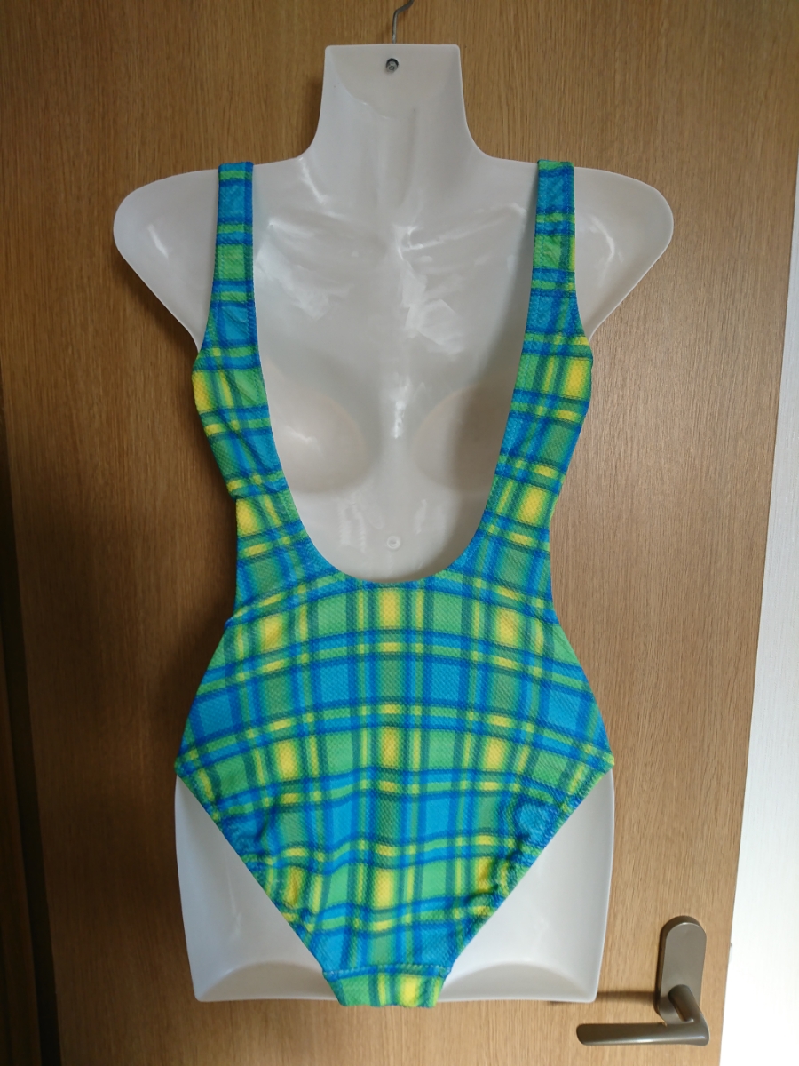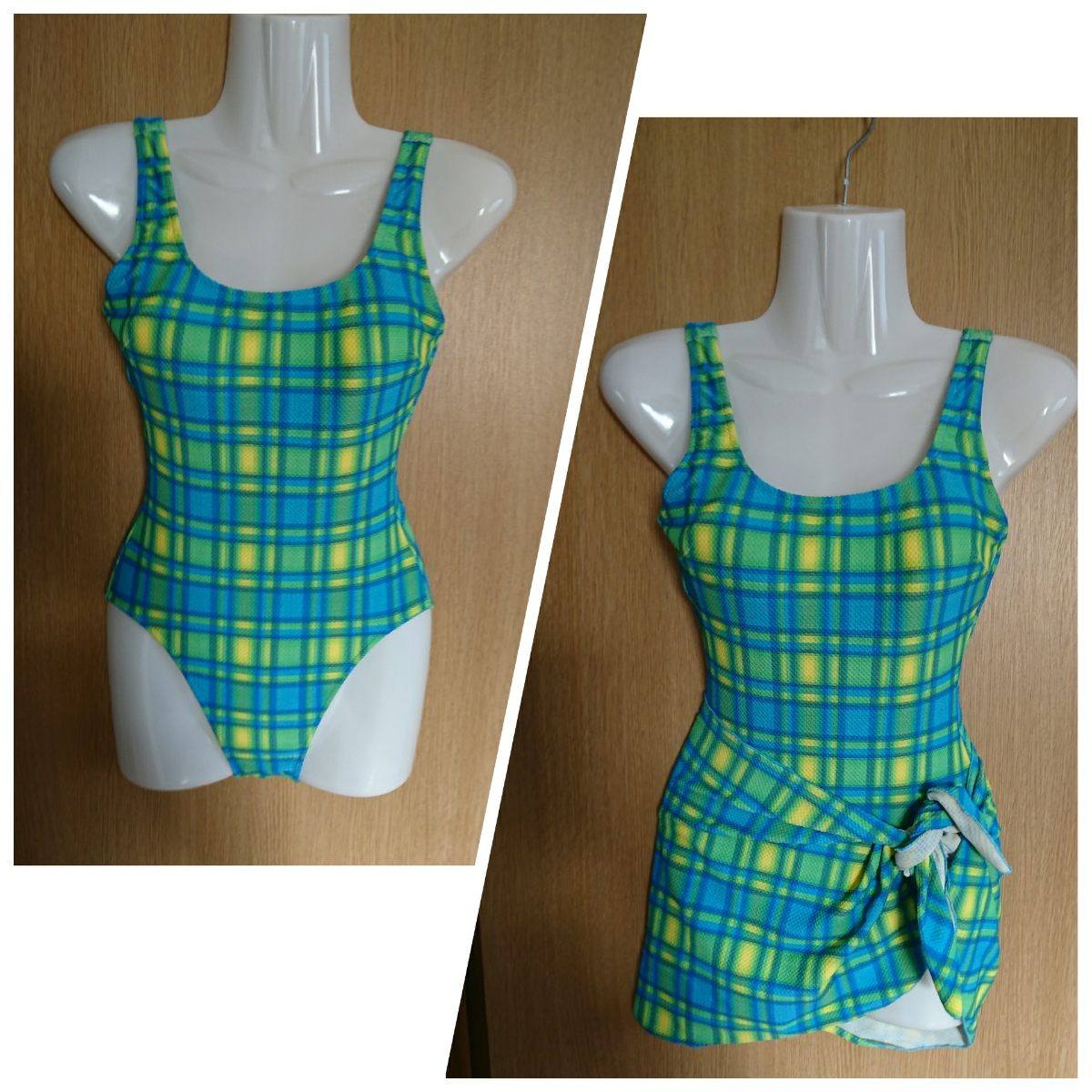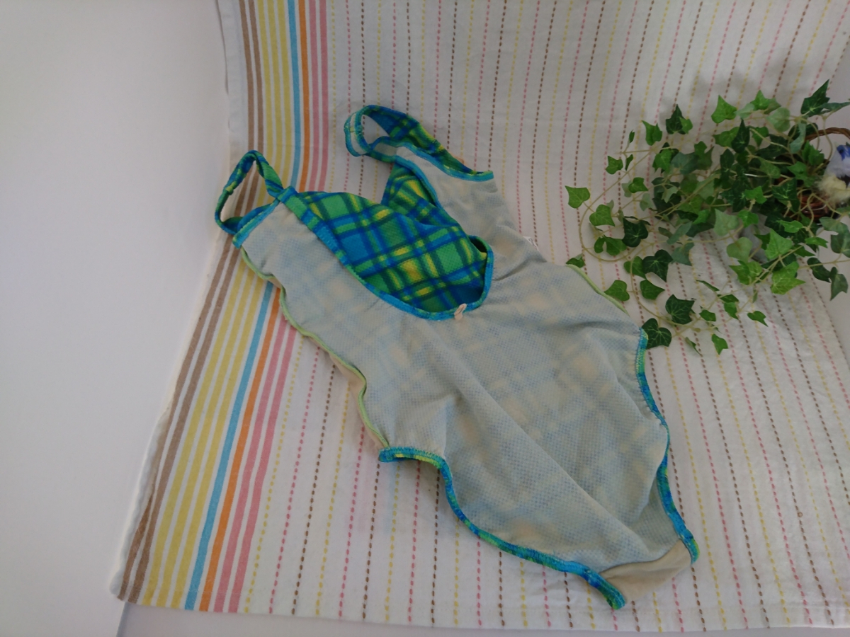 青×黄色×黄緑のチェック柄のワンピース水着2点セットです