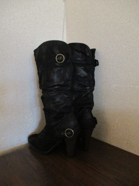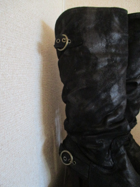 商品紹介 | 黒のスエードのようなベロアのような加工がされた素材のニーハイブーツです。 シワ加工や履き口、かかとのベルト飾りも可愛いです。 *折りたたんでの発送となります |