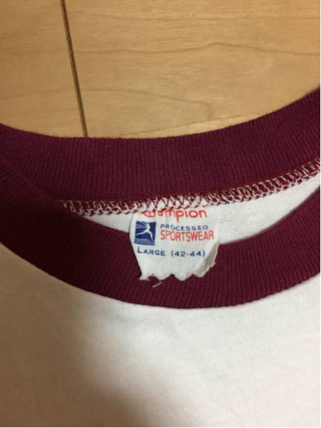 ビンテージのチャンピオンのランタグTシャツです。デッドストックで購入して一度だけ着用したため画像2枚目でわかるようにまだギザギザが残っています。とても古い物でビンテージですので神経質な方や年代物にご理解頂けない方はご遠慮ください。