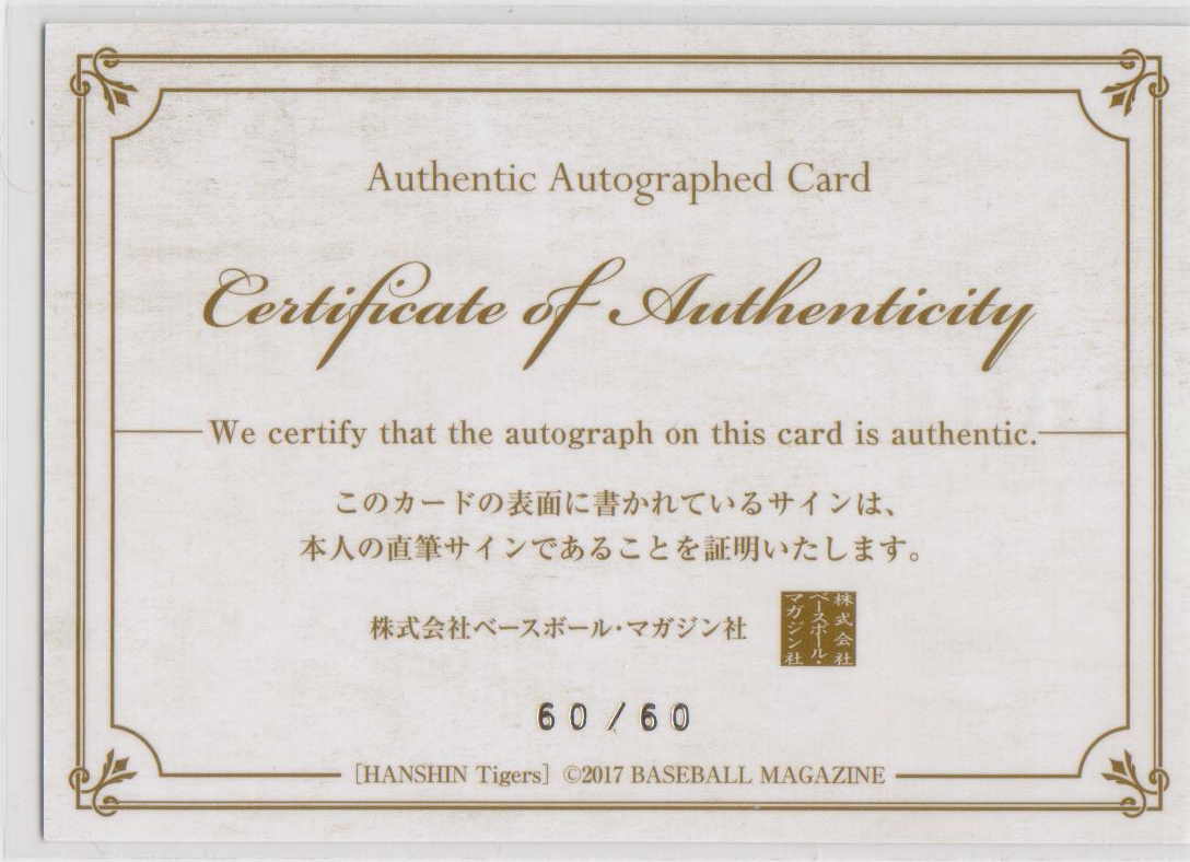 パックから出る直筆サインカードで、シリアルナンバーが入っています。シリアルナンバーは01/60のファーストナンバーです。