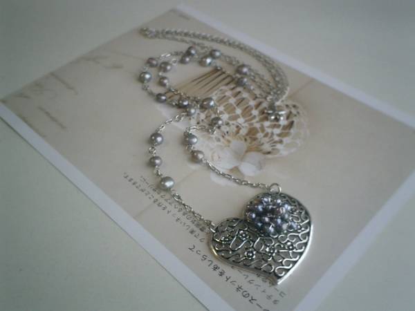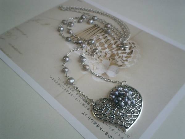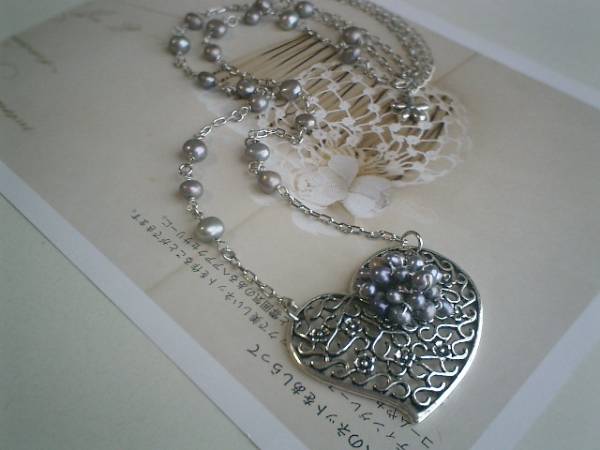 6月のクローゼット・・シリーズです♪淡水パール+ハート・・シルバーグレーの淡水パールにハートの透かしチャームを合わせてキュートなネックレスです♪ハートの透かしチャームには小粒のパールを添えてさりげなくロマンチックしています♪淡水パールは7ミリ位のバロックです♪ハートは5×4センチ位です♪長さは72センチ+アジャスター12センチで最長84センチ位です♪♪お揃いのブレスレットも出品しています♪♪シンプルでいつまでも着けられるデザインを考えて作りました!♪ハンドメイドをご理解頂いてノークレーム、ノーリターンでお願いします