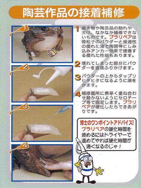 | 商品説明 | プラスチック修理の決定版!! 部品折れ、欠け、補修や再生、ねじ穴再生など・・・ あきらめていたこんなモノまで!?修理できます! 利用例をご用意いたしました、参考になさってください。 ※プラリペアシリーズの他の製品の例も含まれております、ご注意ください。 【セット内容】 プラリペアパウダー(透):30g プラリペア専用リキッド:50mL 専用ニードル スポイト リキッド用容器 小分けカップ 取り扱い説明書 ・この商品はPK-80から「型取くん」を除いたセットです。 ・少し大きめな部位の補修に最適です。 ・割れ、折れ、欠けの接着剤で困っていませんか? ・模り(かたどり)も出来るプラリペアです。 ・車のパーツの修復、オートバイのカウル、ねじ穴の修復、おもちゃ、パソコンなどあなたの大切な物の修復にプラリペアは欠かせません。 ・諦めてしまう前にぜひ、一度お試し下さい。 ・【プラリペアの長所】 ・エポキシ系より硬化が早く5分で固まります。 ・使いやすいので、なんでも修理したくなります。 ・瞬間接着剤など一度使ってまた使うとき中身が固まって使えないなんて経験ないですか? ・プラリペアは、粉と液の必要な分だけ使えます。 ・固まるとアクリル樹脂なので強度もバッチリです。 ・強度が強くノートパソコンなどのヒンジ部分もOK! ・硬化が早く5分で固まり仕事が速く進みます。 ・接着でのご使用でしたら少しの量で、経済的です。 ・必要な分量だけ混ぜて使いますので、長期保存可能です。 商品説明動画 |