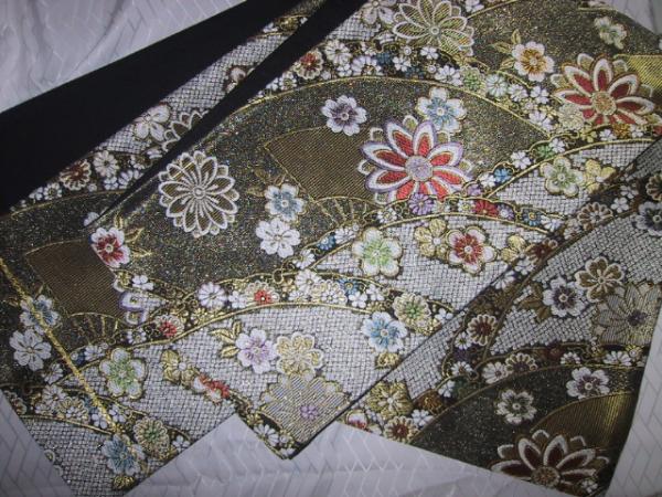 黒金地に薄金通し(裏地はくろ)かいきり(たれ先柄立ち上がり)~かいきりなし(手先柄はし)まで約446,5cmですので、出来上がり予想は約441cmです。巾31,1cm2013