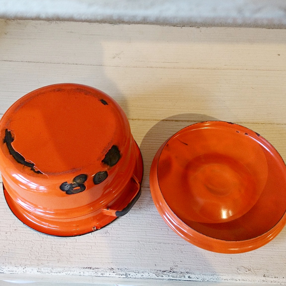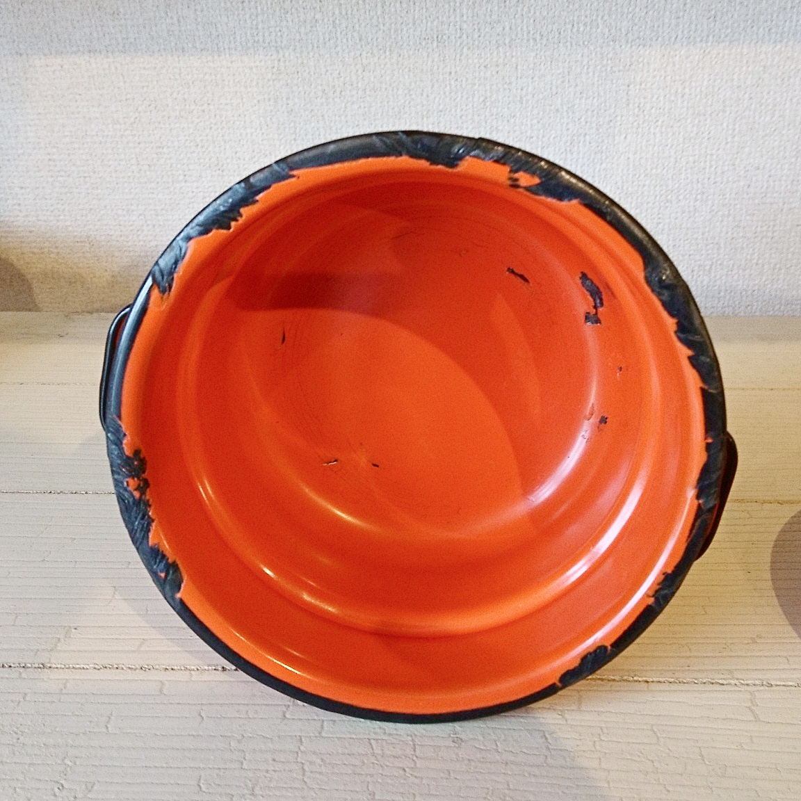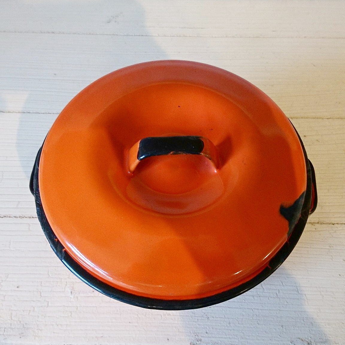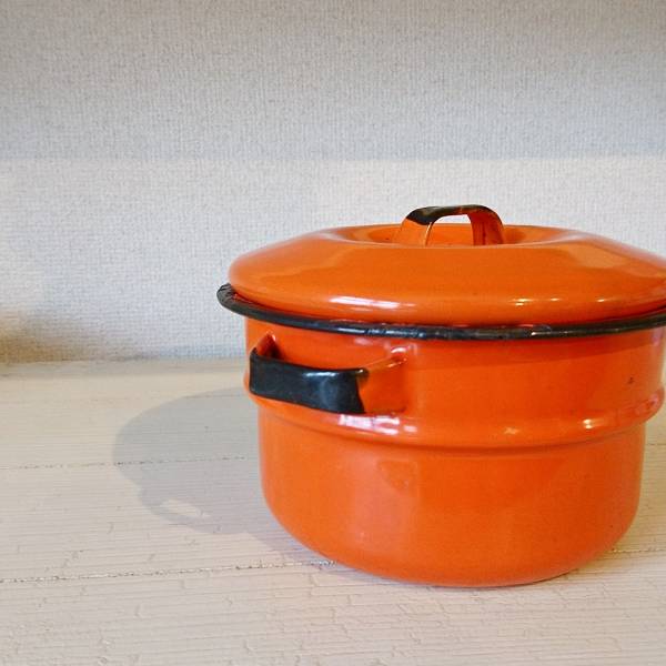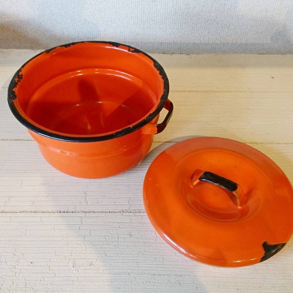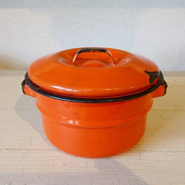 アメリカ製ヴィンテージのホーロー鍋です。色合いとサビのダメージ具合がとても良い雰囲気になっています。