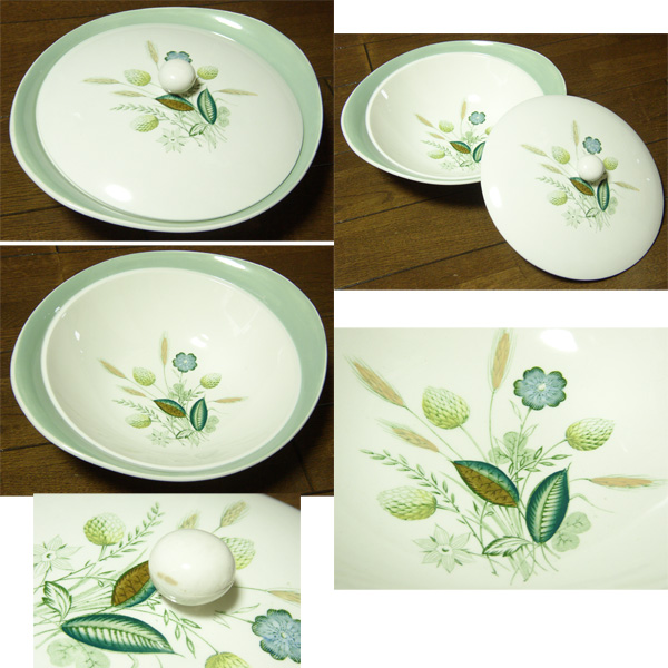 英国購入 ビンテージ WOOD&SONS チュリーンです。状態は、古い物ですので、小さい擦り傷や、丸い持ち手横に薄汚れと(画像3)、上蓋の裏と縁に汚れがありますが(画像3下)、ビンテージの雰囲気ある物です。イギリスで購入しました。デザインや色合いがとても可愛いです。裏に印があります。古い物ですので、状態はそれなりですが、年代物の風格とレトロ感ある物です。縦23cm、横幅26cm、高さ10cmです。ビンテージ物とご理解頂いて、ノークレーム、ノーリターンでお願いします。