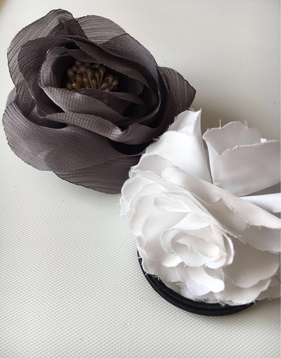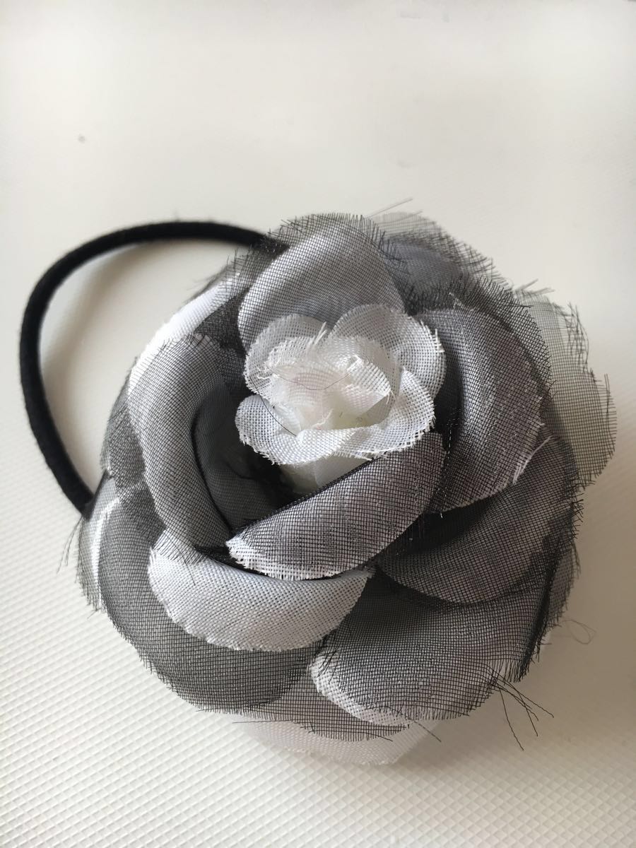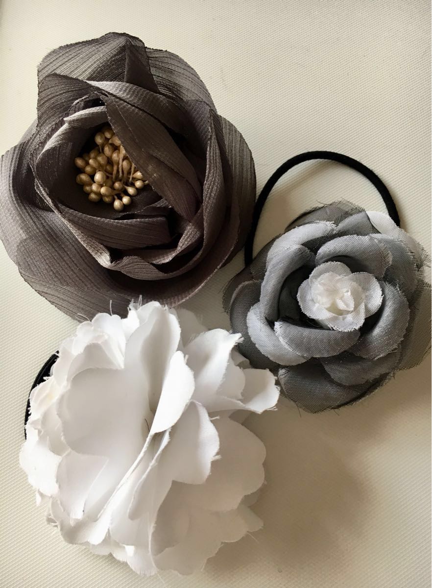 こちらは、グレー と ホワイト の お花のヘアゴムの 3点セットになります。