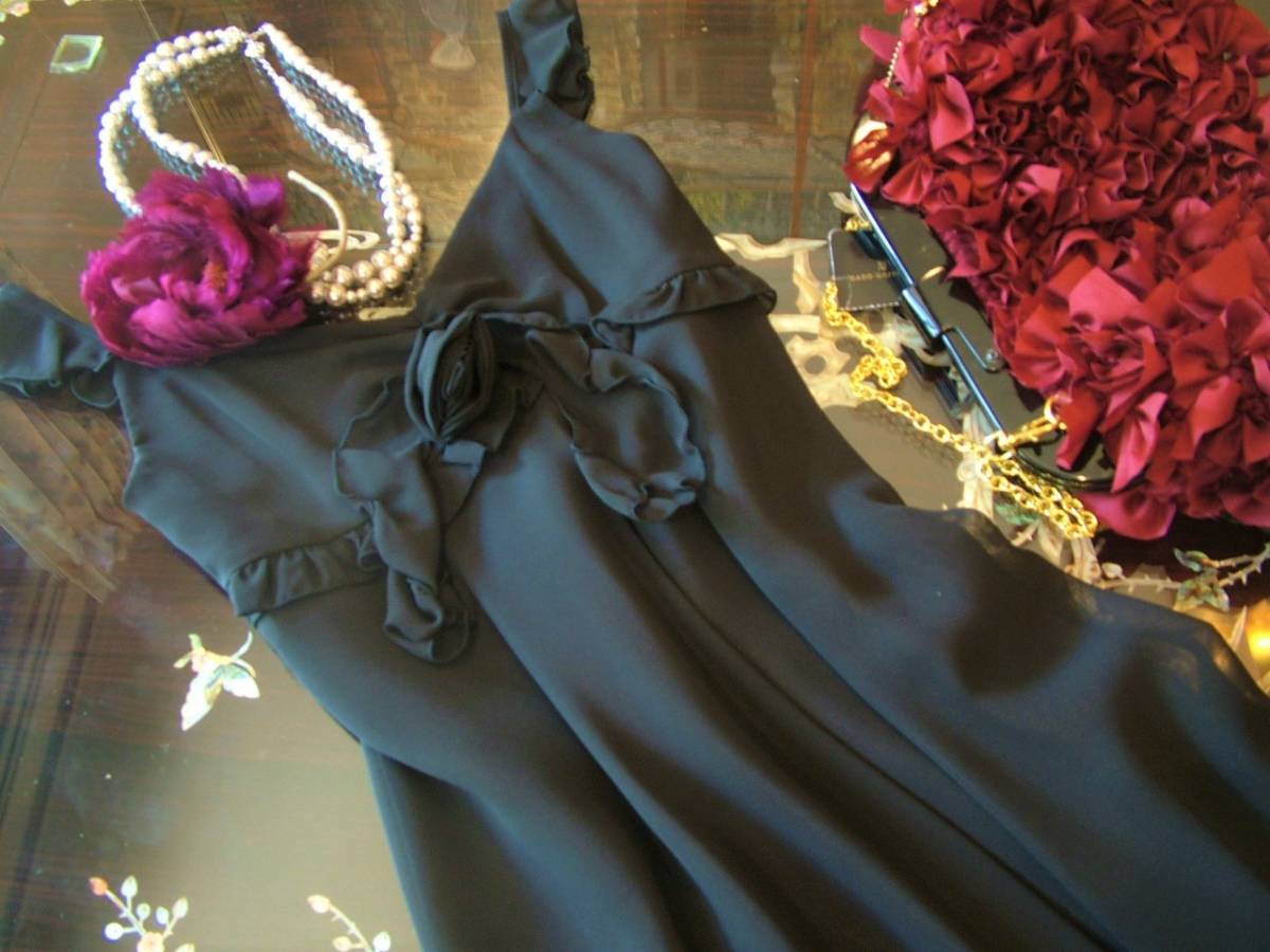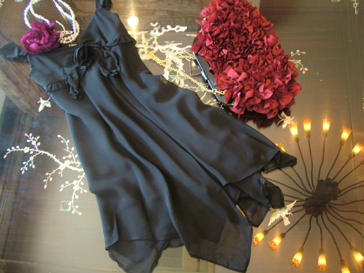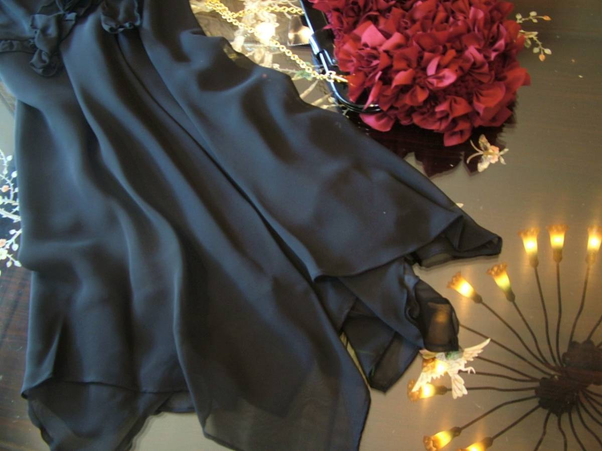 11号 高級 フォーマル ワンピース 黒 シフォン ドレス コサージュ付 フリル 結婚式 発表会 二次会 パーティー