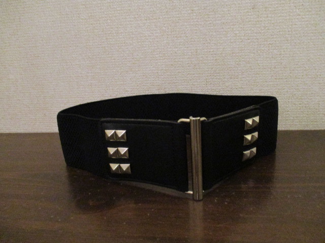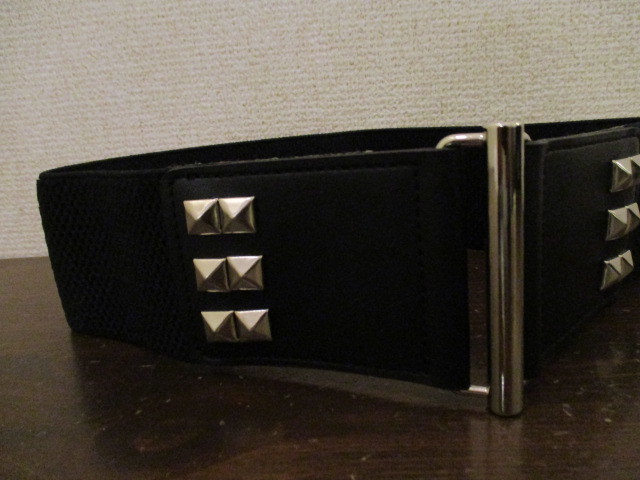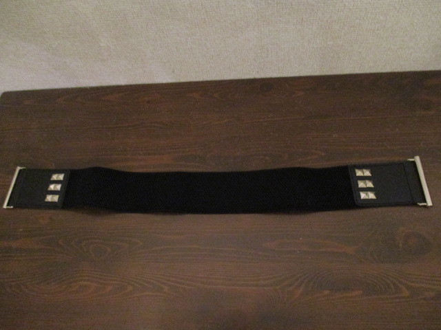| 商品紹介 | 本体は黒の合皮とゴムの組み合わせです。 スタッズデザインがアクセントになっています。 ワンピースなどの見せベルトとして使えます。 |