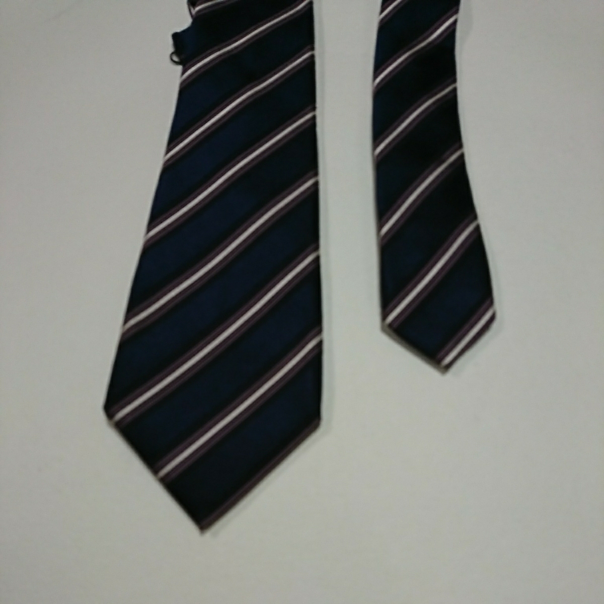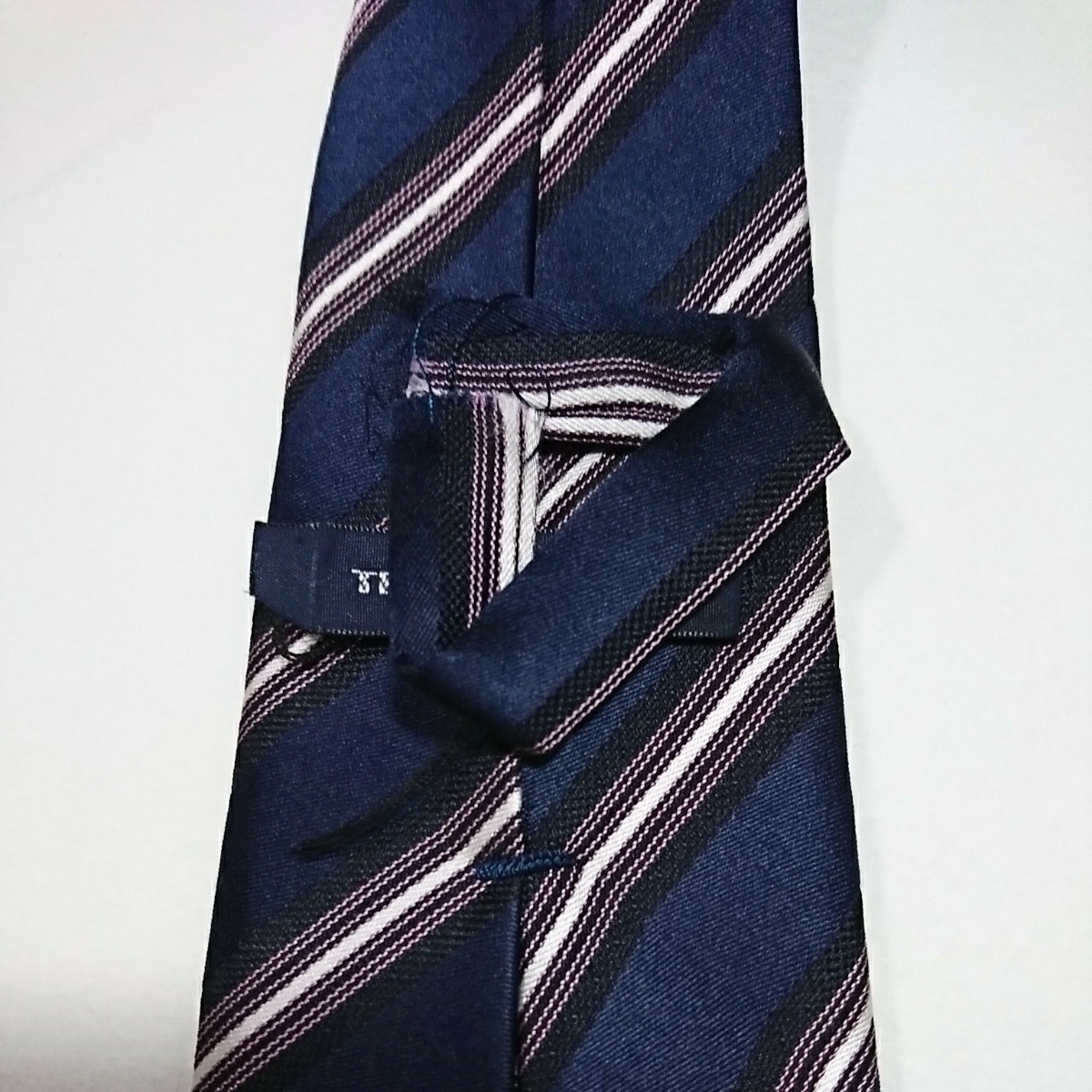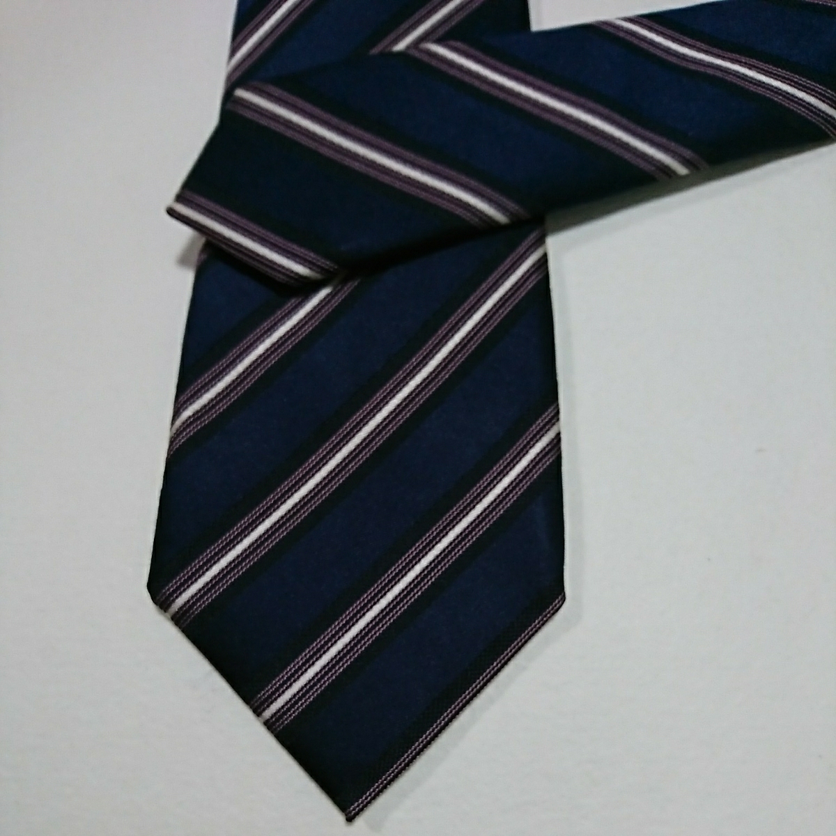 ・紺地に黒、白、紫の斜めラインが入っていてシンプルで落ち着いた感じで合わせやすいと思います。