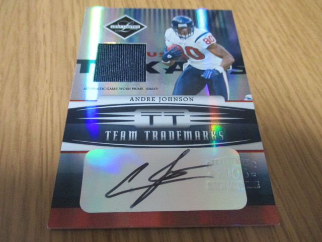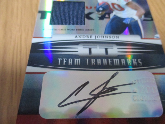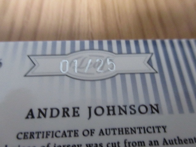 アメリカ4大スポーツのNFLでワイドレシーバーとして大活躍。全盛期はNFLナンバー1レシーバーでした。オールスター{オールプロ}にも何度も出場したスター選手のAndre JohnsonのNFLのゲームで使用したジャージがインサートされて01/25シリアルナンバー入りの直筆サインカードです。かなりの貴重品です。