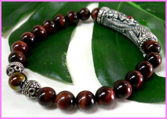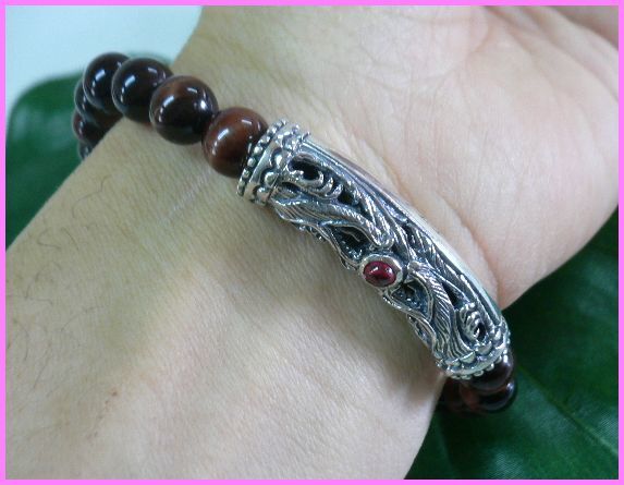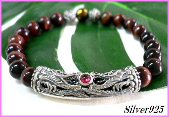 シルバー925銀パーツ龍レッドジルコニア付×天然石8mmレッドタイガーアイ数珠ブレス/ラスト1点