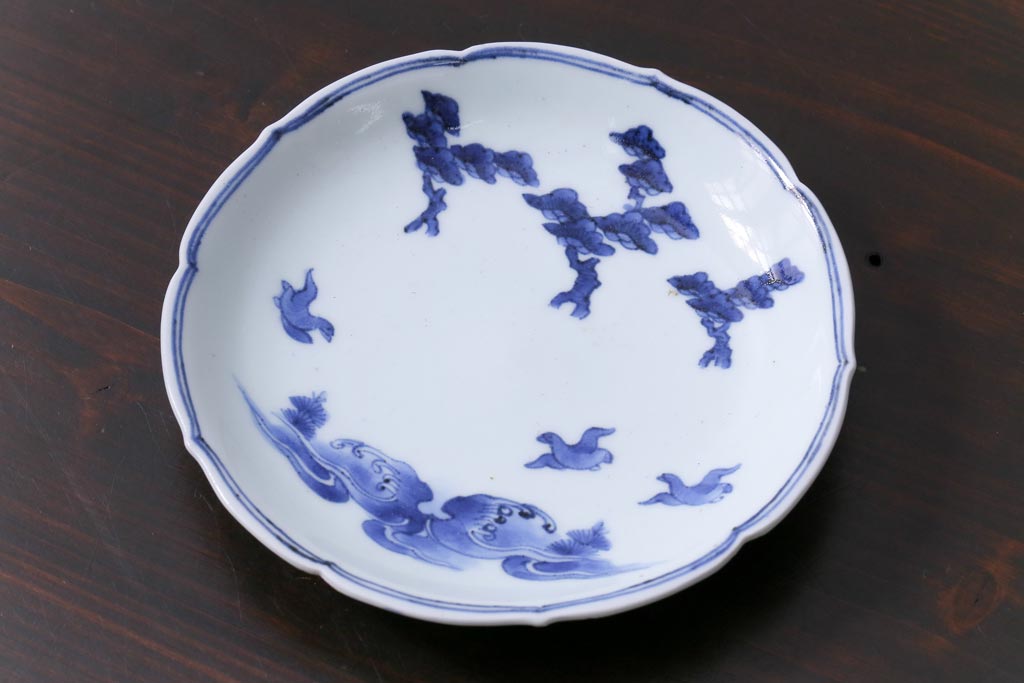 古民具・骨董 江戸期 古伊万里 藍九谷 松と鴎 変形皿(中皿、和食器)(2)