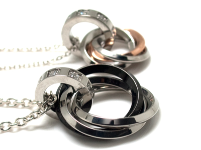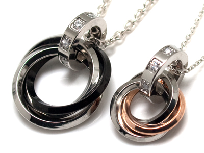 ステンレスペアネックレストリプルリングブラック&トリプルリングピンクゴールド&ジルコニア