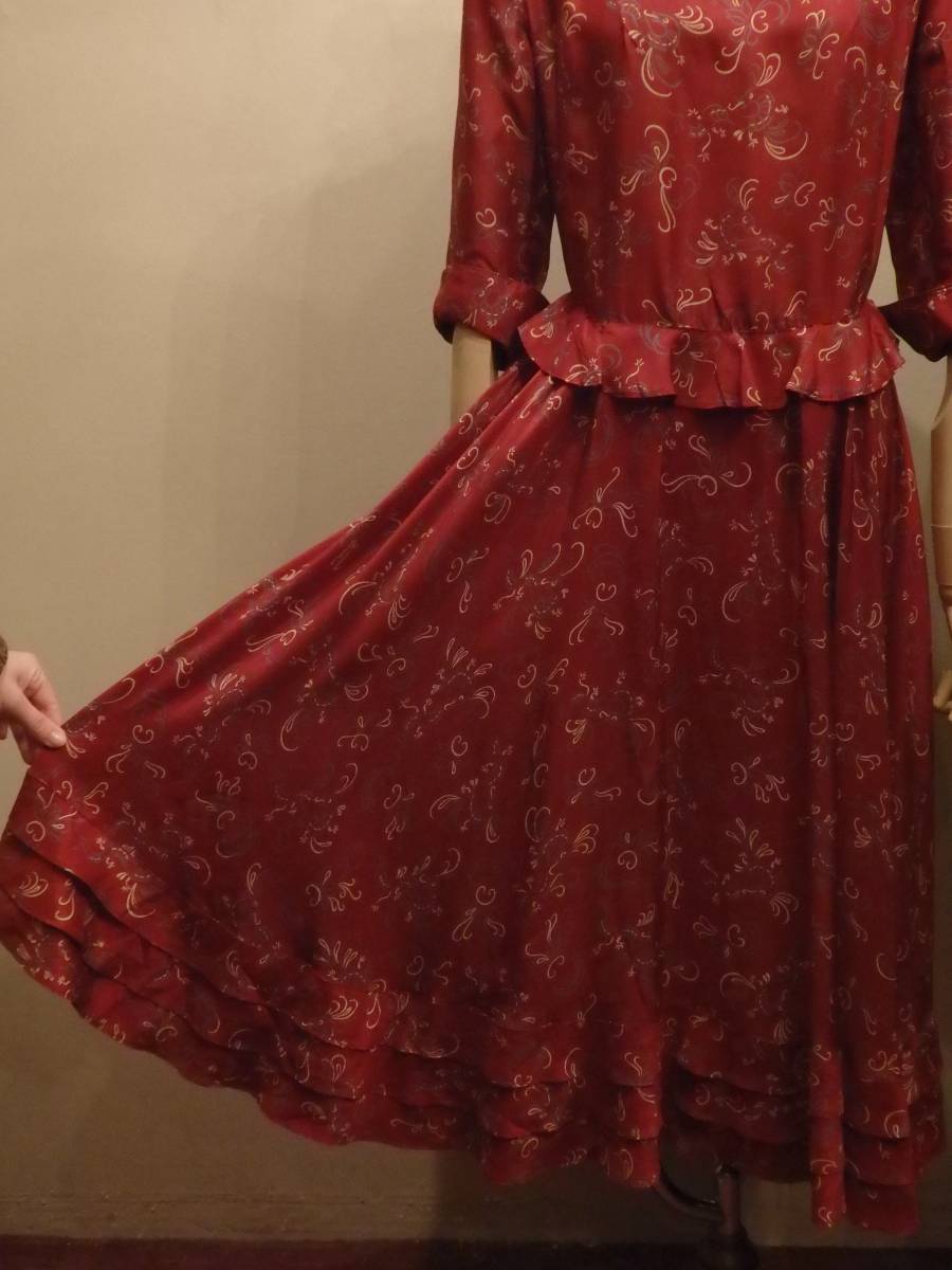 ウエストのフリル、裾の三段段仕立て、詰まった襟元など、細部にわたるまでデザイン性の高さを感じます