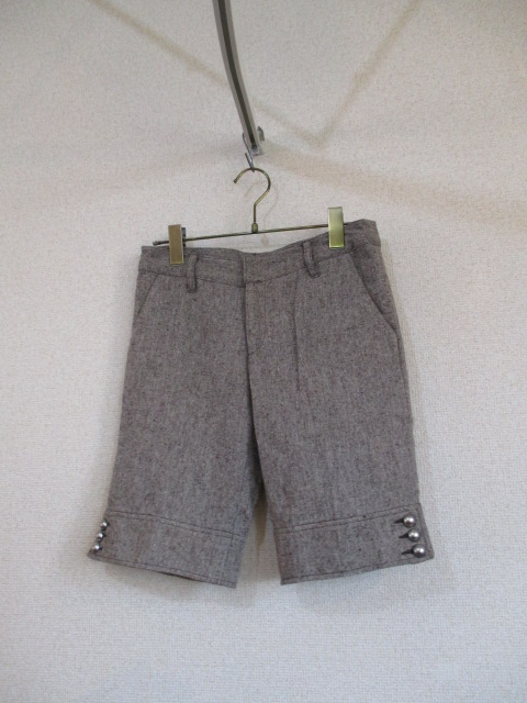 商品紹介 | ツイードのような素材のハーフパンツです。 両裾の外側には3個ずつボタンが付いています。 色は茶と白の糸が混ざったミックスブラウンです。 《素材》 ポリエステル85% 毛15% 裏地:ポリエステル ※割合の記載なし |