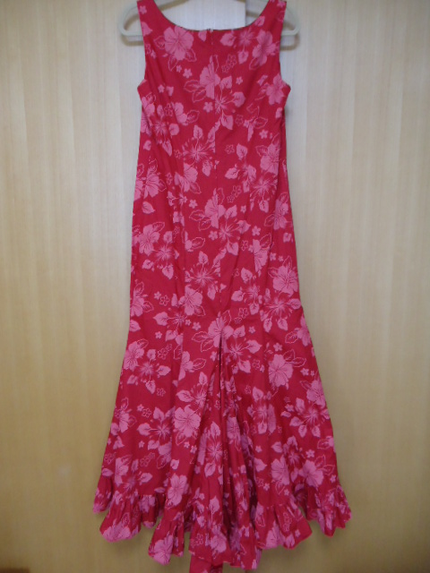 ハワイにて、USED物として、購入しました。C C Fashion社製。コットン35%・ポリエステル65%混合素材。カラーは、赤色地に、ピンク色花・葉っぱ柄です。ハワイ製。後ろファスナーあります。サイズ表示は、11-12とあります。だいたいMぐらいですが、平置き実寸を重視して下さい。なお、当商品のサイズ表示は、全てUSAサイズです。なお、少々誤差は、ご了承下さい。肩幅約36センチ・身幅(脇の下)約43センチ・前丈約130センチ・後ろ丈約148センチです。目立ったダメージありませんが、USED物なので、古着に、ご理解のある方・24時間以内に、お手続き入力後、期限内にかんたん決済、出来る方のみ、ご入札をお願い致します。この商品は、1点物です。 ※※発送方法・送料は、レターパックプラス郵便(追跡可能・手渡し配達・補償無し)ですと、600円又は、ゆうパック送料着払い便(持ち込み割引有り・追跡可能・手渡し配達・補償有り・かんたん決済時は、送料0円ですが、送料のみ到着時支払い)です。※※ ☆★★★★★☆送料は、変わりますが、何点でも、同梱包可能です。数点落札されましたら、まとめて取引を、選択お願いします。☆★★★★★☆
