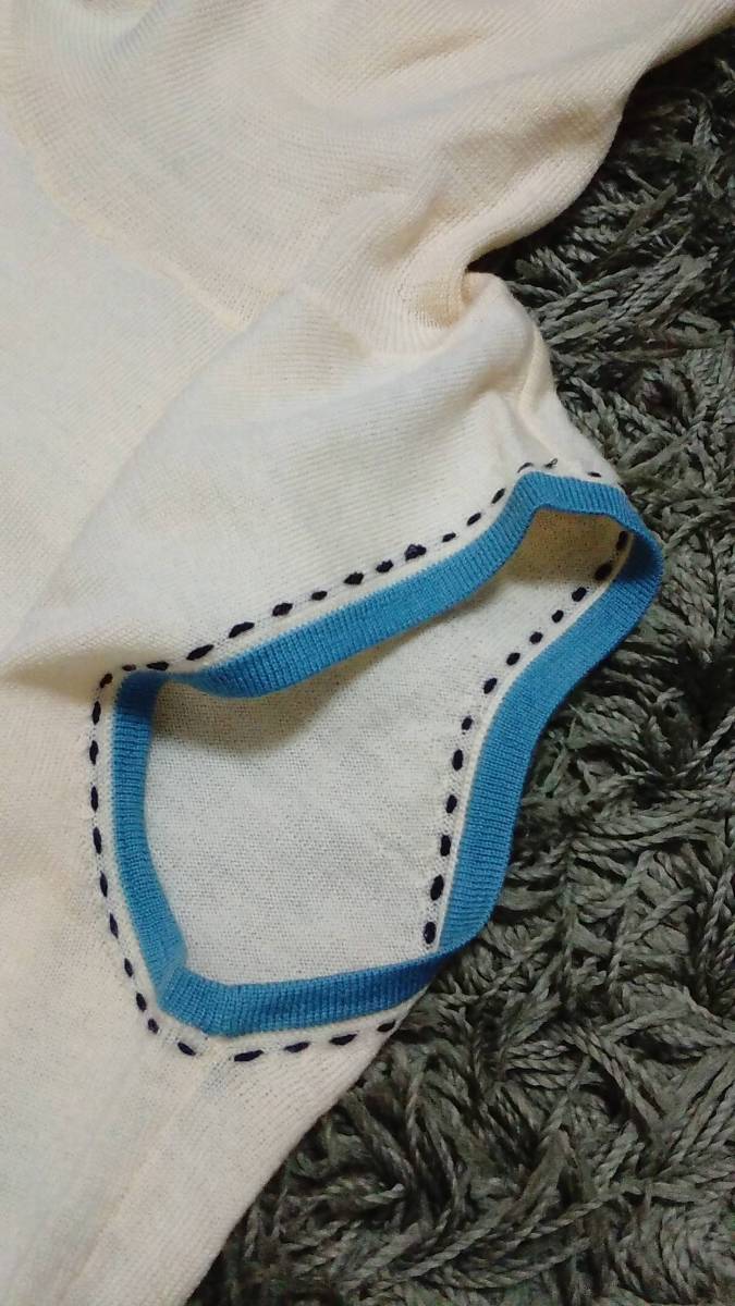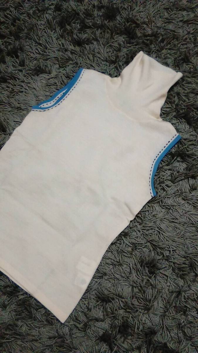 ノースリーブのシンプルなハイゲージハイネックセーターですが、袖口の配色がおしゃれな一枚です。