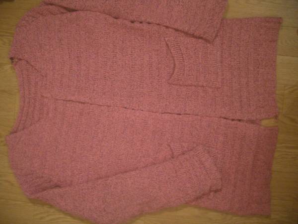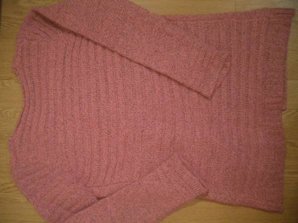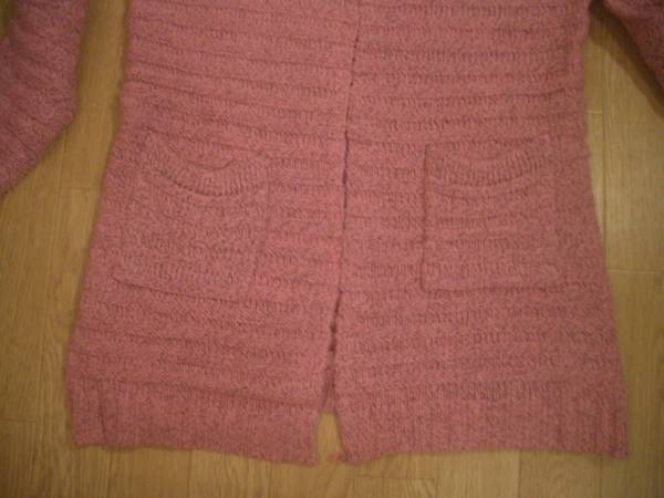 サイズはF、平置きで約肩幅36、脇下身幅47、丈肩から計って67センチ位です(素人採寸ですので目安でお願いします♪)♪ 素材はアクリル100%です。 後ろも同色同素材です♪ 左右にポケットが付いたフロントにはボタンなどが無いデザインです♪♪ あまり流行のない定番のデザインの、割合濃いめのピンク(黒の毛系も少し入っています)が印象的な可愛いニットのカーデです♪