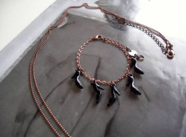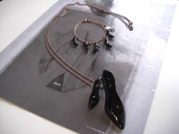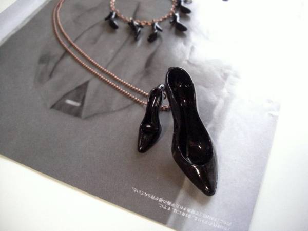 愛らしさの定番・・シリーズです♪ハイヒール・マニア・・キュートな黒のパンプスのネックレスとブレスレットの2点セットです♪大きさ違いの黒のハイヒールを華奢なチェーンに合わせてアンティークモダンな表情です♪パンプスはプラスチック素材なので軽い着け心地でお使いいただけます♪ネックレスのパンプスは65ミリ、37ミリの大きさ違いです♪ネックレスの長さは83センチ+アジャスター10センチで最長93センチ位です♪ブレスレットは25ミリ位のパンプスをランダムに繋いでいます♪長さは17センチ+アジャスター5センチで最長22センチ位です♪シンプルで飽きのこないい つまでも着けられるデザインを考えて作りました!ハンドメイドをご理解頂いてノークレーム、ノーリターンでお願いします