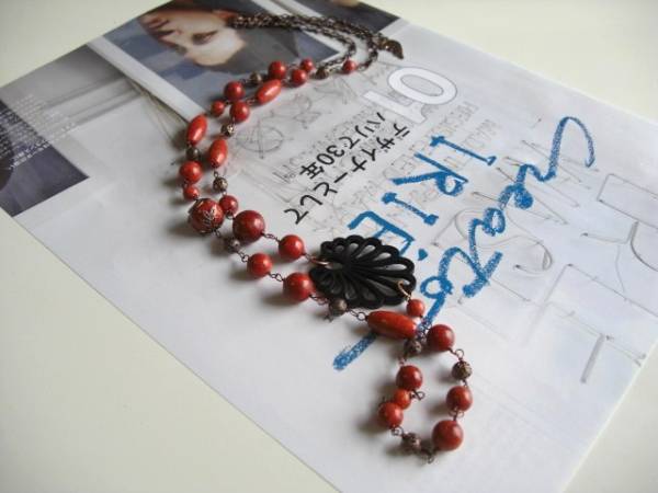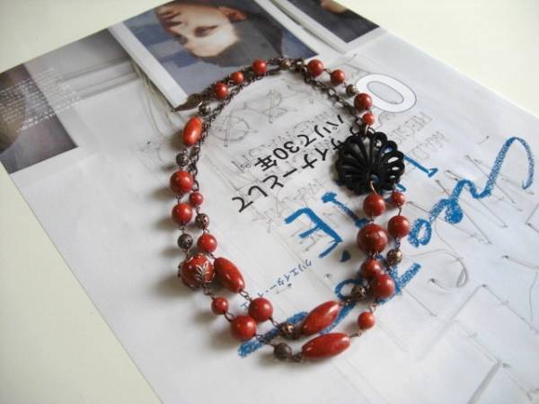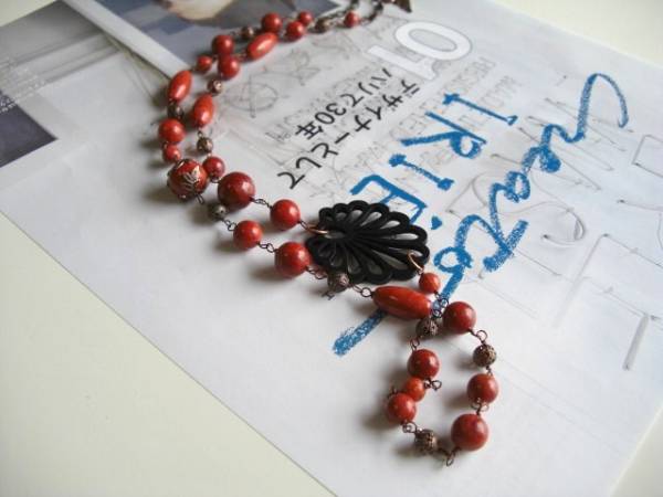 パンク・ガール・・シリーズです♪大人色の赤Ⅴ・・シックなダークレッドのスポンジ珊瑚のネックレスです♪軽い付け心地で楽しんでいただけます♪マッ トな深い赤の珊瑚は6ミリから17ミリ位までの丸玉やナツメです♪アンティークなデザインの透かしウッドやデザインチャームを合わせてオリエンタルな表情です♪長さは全長90センチ位で調節自由です♪画像のように2連にされても素敵です♪お揃いのブレスレットも出品しています♪シンプルで飽きのこないいつまでも着けられる デザインを考えて作りました!ハンドメイドをご理解頂いてノークレーム、ノーリターンでお願いします
