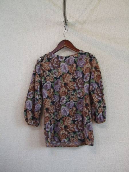 | 商品紹介 | バラ柄がオシャレなニットカットソーです。 肩のビジューがとてもステキです。 地色は深緑で、バラの部分は紫、茶、緑等です。 《素材》 ポリエステル95% ポリウレタン5% |